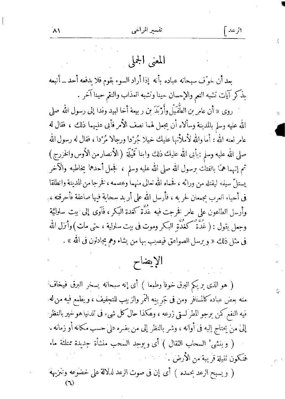 (هُوَ الَّذِي يُرِيكُمُ الْبَرْقَ خَوْفاً وَطَمَعاً) أي إنه سبحانه يسخّر البرق فيخاف منه بعض عباده كالمسافر ومن فى جرينه التمر والزبيب للتجفيف، ويطمع فيه من له فيه النفع كمن يرجو المطر لسقى زرعه، وهكذا حال كل شىء فى الدنيا هو خير بالنظر إلى من يحتاج إليه فى أوانه، وشر بالنظر إلى من يضره بحسب مكانه أو زمانه.