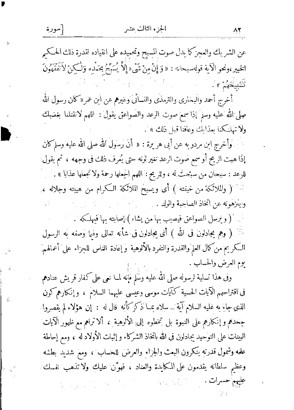 وأخرج ابن مردويه عن أبى هريرة: «أن رسول الله صلى الله عليه وسلّم كان إذا هبّت الريح أو سمع صوت الرعد تغيّر لونه حتى يعرف ذلك فى وجهه، ثم يقول للرعد: سبحان من سبّحت له، وللريح: اللهم اجعلها رحمة ولا تجعلها عذابا» .