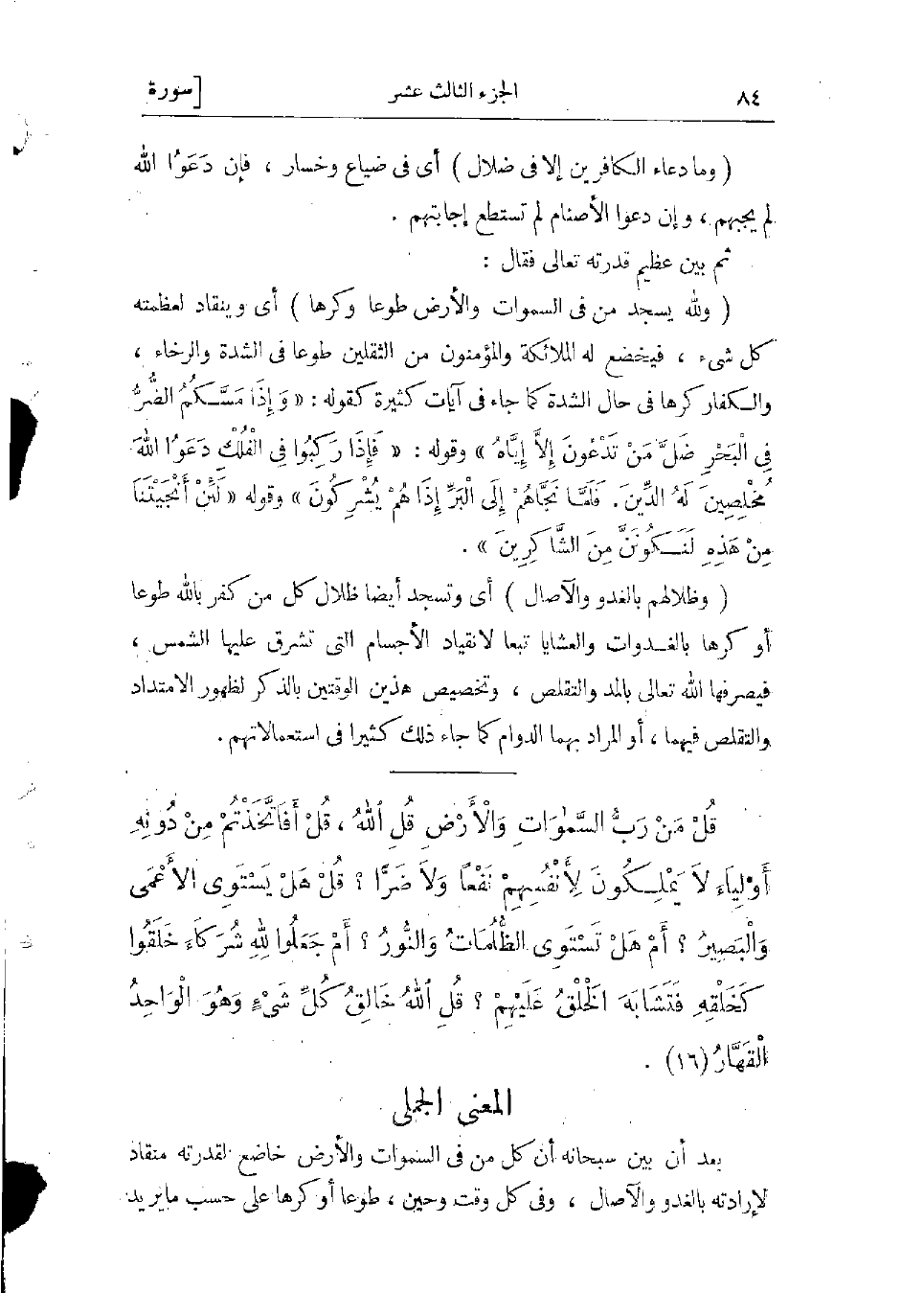 (وَلِلَّهِ يَسْجُدُ مَنْ فِي السَّماواتِ وَالْأَرْضِ طَوْعاً وَكَرْهاً) أي وينقاد لعظمته كل شىء، فيخضع له الملائكة والمؤمنون من الثقلين طوعا فى الشدة والرخاء، والكفار كرها فى حال الشدة كما جاء فى آيات كثيرة كقوله: «وَإِذا مَسَّكُمُ الضُّرُّ فِي الْبَحْرِ ضَلَّ مَنْ تَدْعُونَ إِلَّا إِيَّاهُ» وقوله: «فَإِذا رَكِبُوا فِي الْفُلْكِ دَعَوُا اللَّهَ مُخْلِصِينَ لَهُ الدِّينَ. فَلَمَّا نَجَّاهُمْ إِلَى الْبَرِّ إِذا هُمْ يُشْرِكُونَ» وقوله: «لَئِنْ أَنْجَيْتَنا مِنْ هذِهِ لَنَكُونَنَّ مِنَ الشَّاكِرِينَ» .