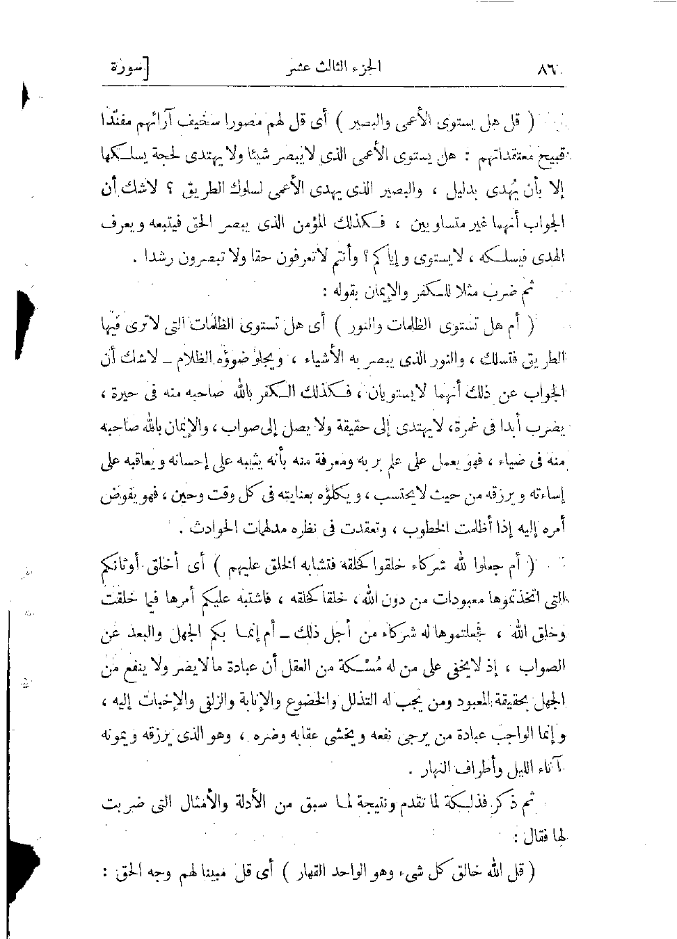 (أَمْ جَعَلُوا لِلَّهِ شُرَكاءَ خَلَقُوا كَخَلْقِهِ فَتَشابَهَ الْخَلْقُ عَلَيْهِمْ) أي بل أخلق أوثانكم التي اتخذتموها معبودات من دون الله، خلقا كخلقه، فاشتبه عليكم أمرها فيما خلقت وخلق الله، فجعلتموها له شركاء من أجل ذلك- أم إنما بكم الجهل والبعد عن الصواب، إذ لا يخفى على من له مسكة من العقل، أن عبادة ما لا يضر ولا ينفع، من الجهل بحقيقة المعبود، ومن يجب له التذلل والخضوع، والإنابة والزلفى والإخبات إليه، وإنما الواجب عبادة من يرجى نفعه ويخشى عقابه وضرّه، وهو الذي يرزقه ويمونه آناء الليل وأطراف النهار.