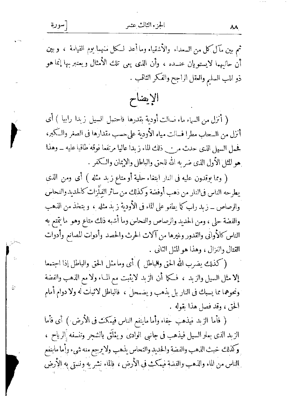 (كَذلِكَ يَضْرِبُ اللَّهُ الْحَقَّ وَالْباطِلَ) أي وما مثل الحق والباطل إذا اجتمعا إلا مثل السيل والزبد، فكما أن الزبد لا يثبت مع الماء ولا مع الذهب والفضة ونحوهما مما يسبك فى النار بل يذهب ويضمحل، فالباطل لاثبات له ولا دوام أمام الحق.