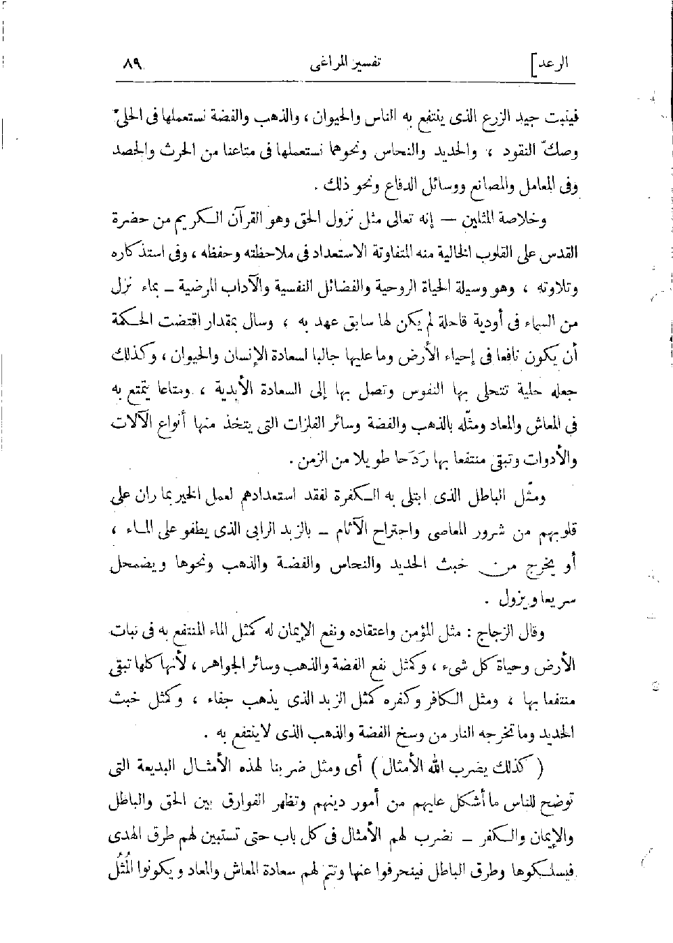 وخلاصة المثلين- أنه تعالى مثل نزول الحق وهو القرآن الكريم من حضرة القدس، على القلوب الخالية منه، المتفاوتة الاستعداد فى ملاحظته وحفظه، وفى استذكاره وتلاوته، وهو وسيلة الحياة الروحية والفضائل النفسية والآداب المرضية- بماء نزل من السماء فى أودية قاحلة لم يكن لها سابق عهد به، وسال بمقدار اقتضت الحكمة أن يكون نافعا فى إحياء الأرض وما عليها، جالبا لسعادة الإنسان والحيوان، وكذلك جعله حلية تتحلى بها النفوس، وتصل بها إلى السعادة الأبدية، ومتاعا يتمتع به فى المعاش والمعاد، ومثله بالذهب والفضة وسائر الفلزات التي يتخذ منها أنواع الآلات والأدوات، وتبقى منتفعا بها ردحا طويلا من الزمن.