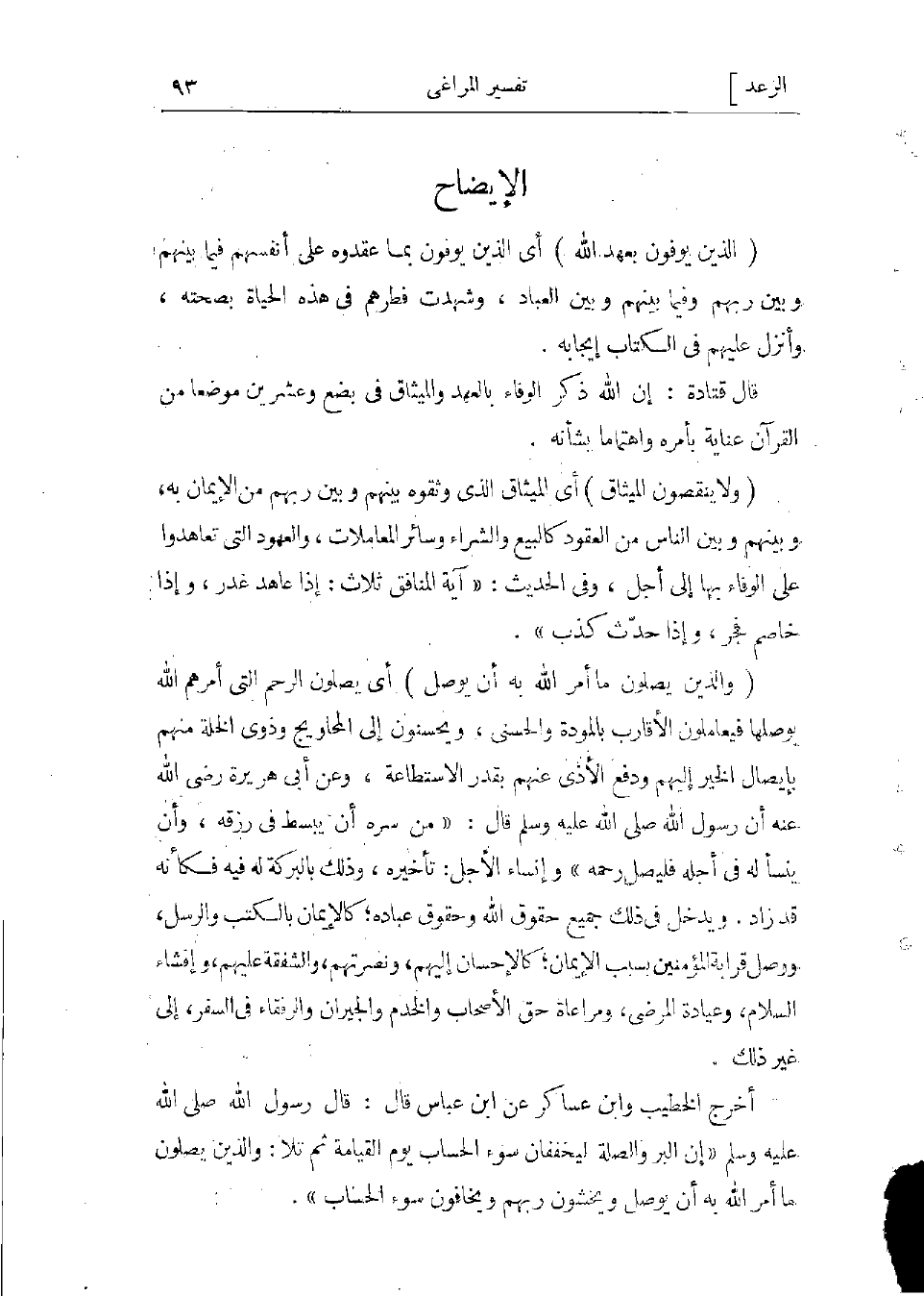ويدخل فى ذلك جميع حقوق الله وحقوق عباده كالإيمان بالكتب والرسل، ووصل قرابة المؤمنين بسبب الإيمان كالإحسان إليهم، ونصرتهم، والشفقة عليهم، وإفشاء السلام، وعيادة المرضى، ومراعاة حق الأصحاب والخدم والجيران والرفقة فى السفر إلى غير ذلك.