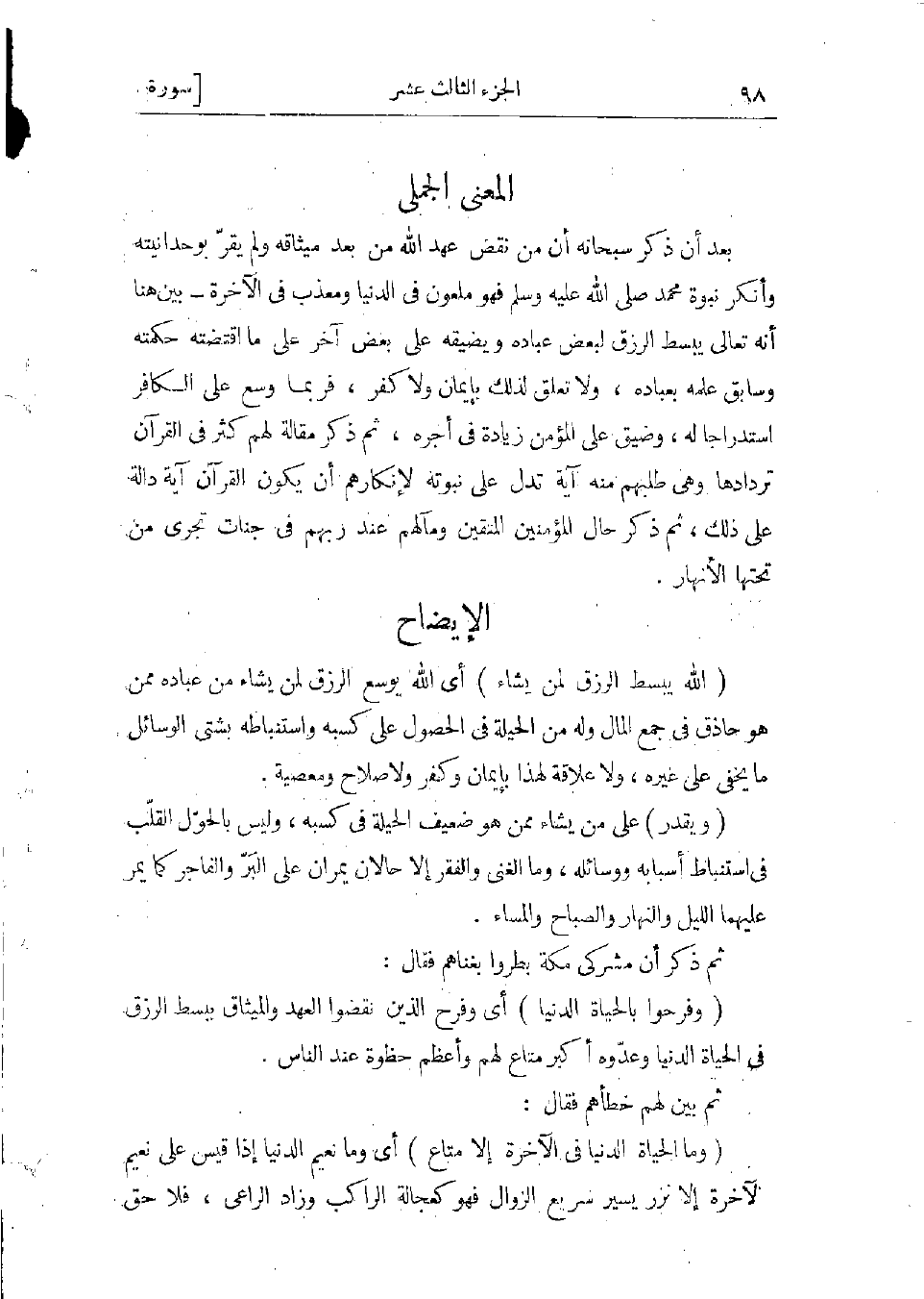 بعد أن ذكر سبحانه أن من نقض عهد الله من بعد ميثاقه ولم يقرّ بوحدانيته وأنكر نبوة محمد صلى الله عليه وسلّم فهو ملعون فى الدنيا ومعذب فى الآخرة- بين هنا أنه تعالى يبسط الرزق لبعض عباده ويضيقه على بعض آخر على ما اقتضته حكمته وسابق علمه بعباده، ولا تعلق لذلك بإيمان ولا كفر، فربما وسع على الكافر استدراجا له وضيّق على المؤمن زيادة فى أجره، ثم ذكر مقالة لهم كثر فى القرآن تردادها وهى طلبهم منه آية تدل على نبوته لإنكارهم أن يكون القرآن آية دالة على ذلك، ثم ذكر حال المؤمنين المتقين ومآلهم عند ربهم فى جنات تجرى من تحتها الأنهار.