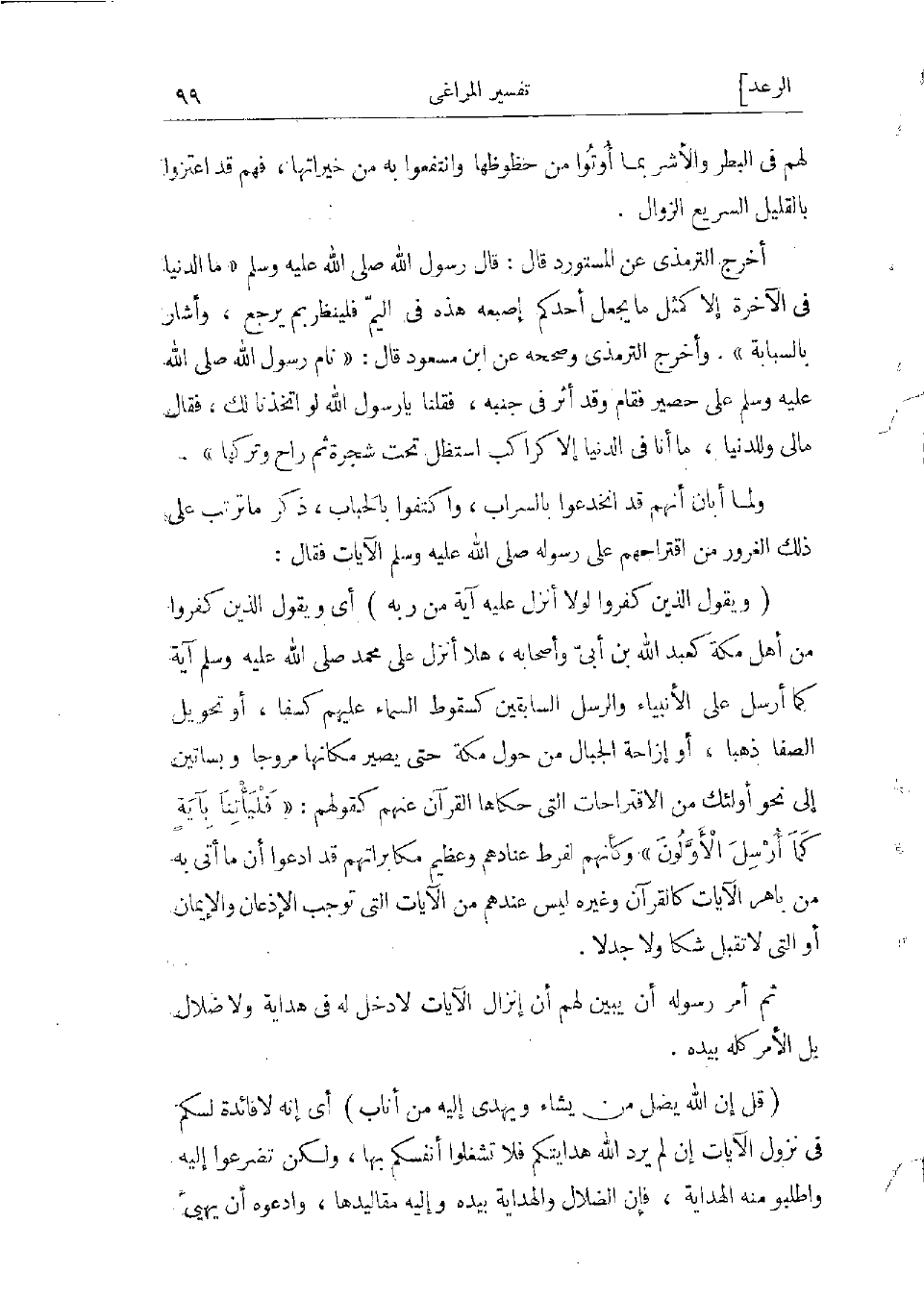 وأخرج الترمذي وصححه عن ابن مسعود قال: «نام رسول الله صلى الله عليه وسلّم على حصير فقام وقد أثّر فى جنبه، فقلنا يا رسول الله لو اتخذنا لك، فقال مالى وللدنيا، ما أنا فى الدنيا إلا كراكب استظل تحت شجرة ثم راح وتركها» .