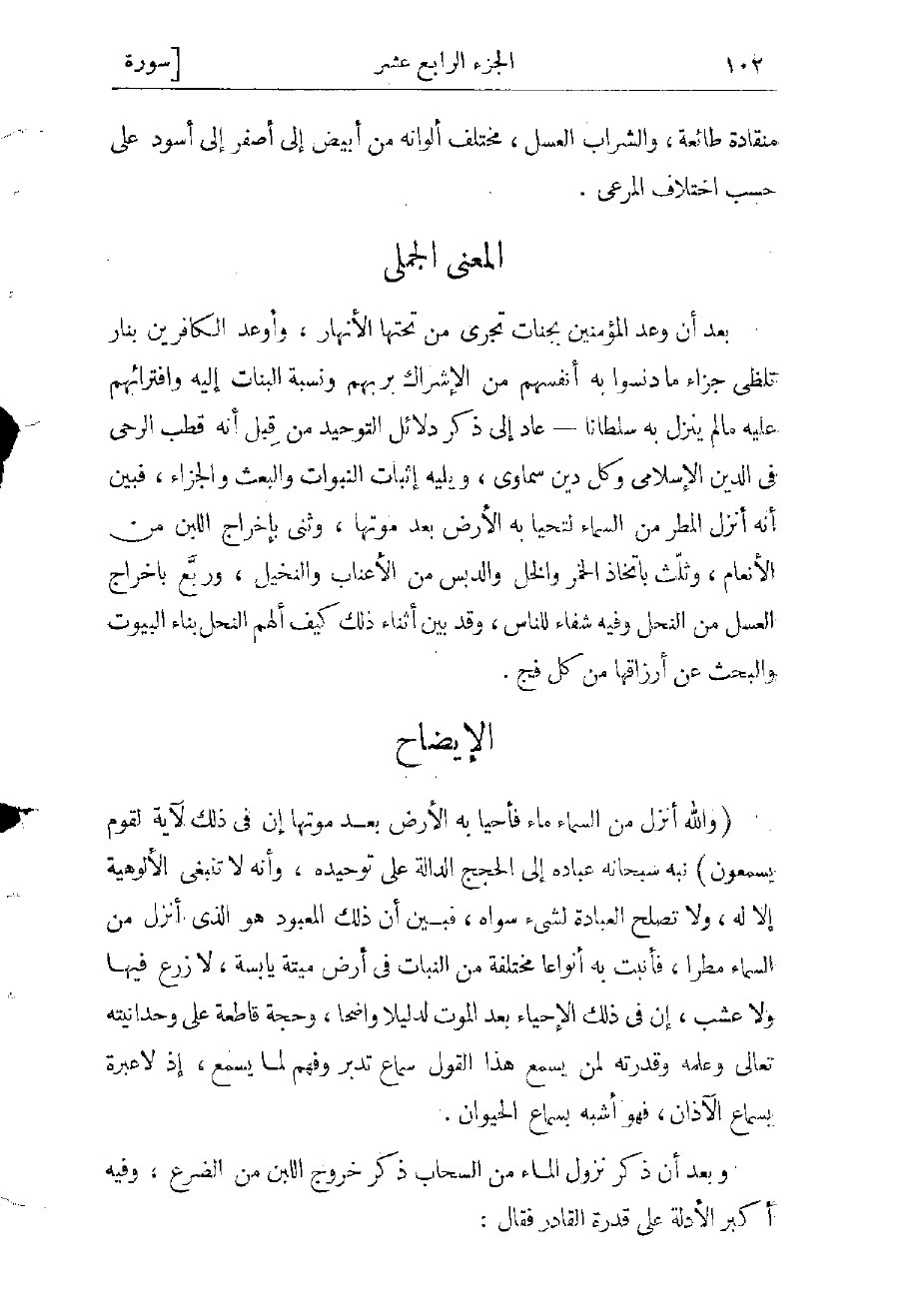 بعد أن وعد المؤمنين بجنات تجرى من تحتها الأنهار، وأوعد الكافرين بنار تلظّى، جزاء ما دنّسوا به أنفسهم من الإشراك بربهم ونسبة البنات إليه وافترائهم عليه ما لم ينزل به سلطانا- عاد إلى ذكر دلائل التوحيد من قبل أنه قطب الرحى فى الدين الإسلامى وكل دين سماوى، ويليه إثبات النبوات والبعث والجزاء، فبين أنه أنزل المطر من السماء لتحيا به الأرض بعد موتها، وثنىّ بإخراج اللبن من الأنعام، وثلث باتخاذ الخمر والخل والدّبس من الأعناب والنخيل، وربع بإخراج العسل من النحل وفيه شفاء للناس، وقد بين أثناء ذلك كيف ألهم النحل بناء البيوت والبحث عن أرزاقها من كل فجّ.