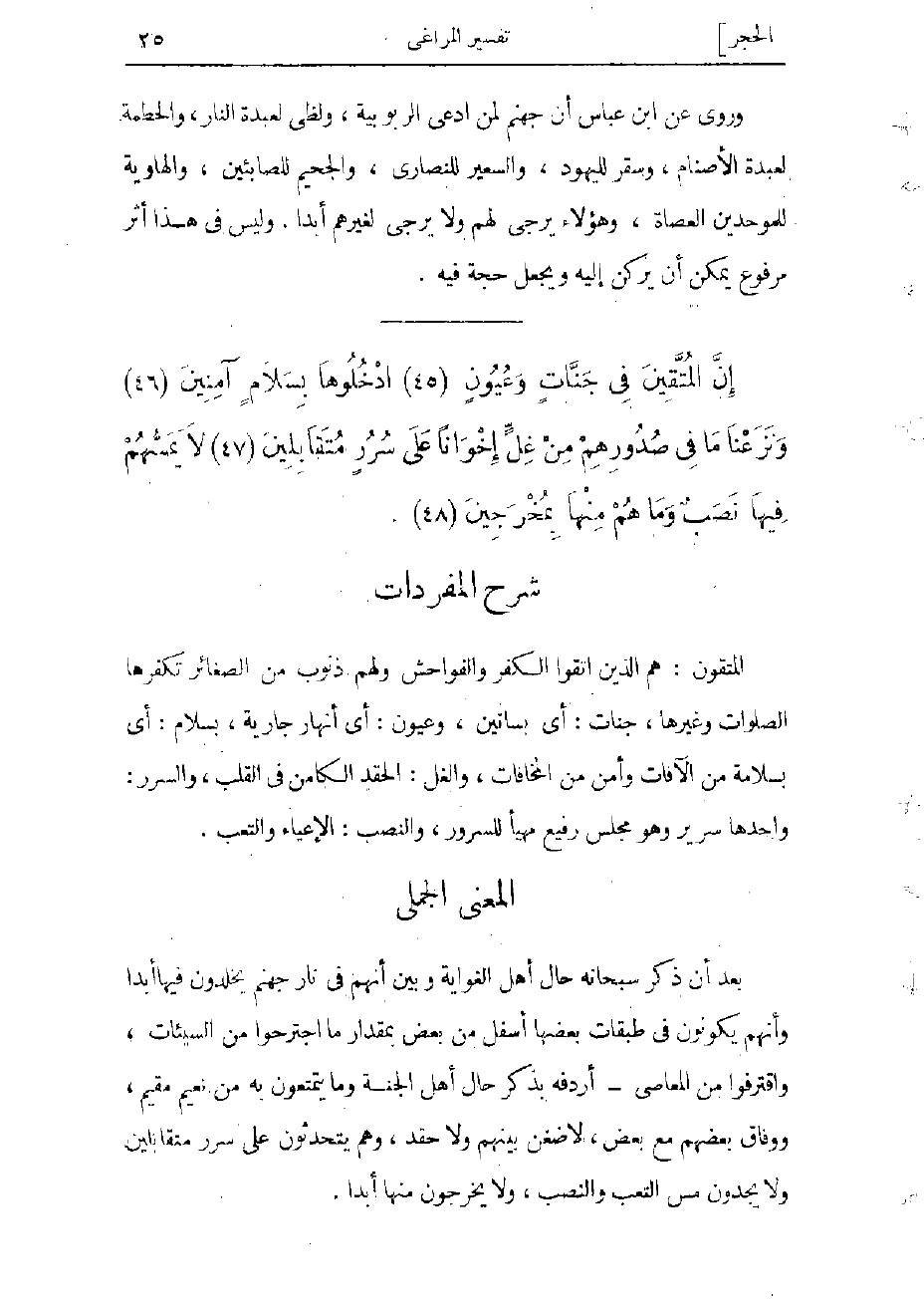 المتقون: هم الذين اتقوا الكفر والفواحش ولهم ذنوب من الصغائر تكفرها الصلوات وغيرها، جنات: أي بساتين، وعيون: أي أنهار جارية، بسلام: أي بسلامة من الآفات، وأمن من المخافات، والغل: الحقد الكامن فى القلب، والسرر: واحدها سرير وهو مجلس رفيع مهيأ للسرور، والنصب: الإعياء والتعب.