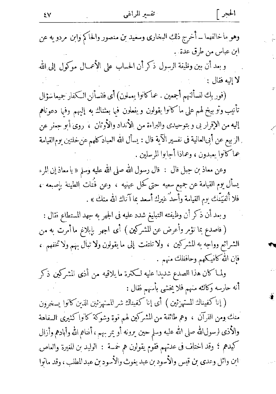 (فَوَ رَبِّكَ لَنَسْئَلَنَّهُمْ أَجْمَعِينَ. عَمَّا كانُوا يَعْمَلُونَ) أي فلنسألن الكفار جميعا سؤال تأنيب وتوبيخ لهم على ما كانوا يقولون ويفعلون فيما بعثناك به إليهم وفيما دعوناهم إليه من الإقرار بي وبتوحيدي والبراءة من الأنداد والأوثان، روى أبو جعفر عن الربيع عن أبى العالية فى تفسير الآية قال: يسأل الله العباد كلهم عن خلّتين يوم القيامة عما كانوا يعبدون، وعماذا أجابوا المرسلين.