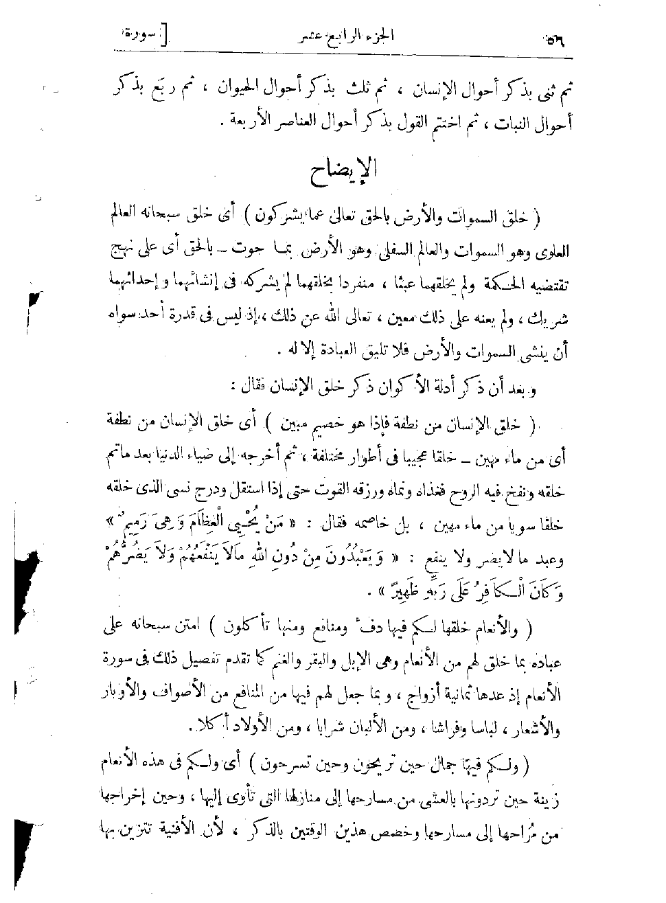 (خَلَقَ الْإِنْسانَ مِنْ نُطْفَةٍ فَإِذا هُوَ خَصِيمٌ مُبِينٌ) أي خلق الإنسان من نطفة أي من ماء مهين- خلقا عجيبا فى أطوار مختلفة، ثم أخرجه إلى ضياء الدنيا بعد ماتم خلقه، ونفخ فيه الروح، فغذاه ونماه ورزقه القوت، حتى إذا استقل ودرج نسى الذي خلقه خلقا سويا من ماء مهين، بل خاصمه فقال: «مَنْ يُحْيِ الْعِظامَ وَهِيَ رَمِيمٌ» وعبد ما لا يضر ولا ينفع: «ويعبدون من دون الله ما لا ينفعهم ولا يضرّهم وكان الكافر على ربّه ظهيرا» .