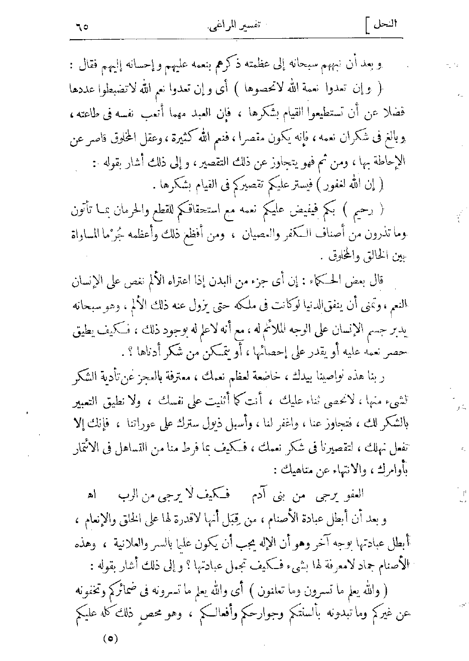 قال بعض الحكماء: إن أىّ جزء من البدن إذا اعتراه الألم نغّص على الإنسان النعم، وتمنى أن ينفق الدنيا لو كانت فى ملكه حتى يزول عنه ذلك الألم، وهو سبحانه يدبّر جسم الإنسان على الوجه الملائم له، مع أنه لا علم له بوجود ذلك، فكيف يطيق حصر نعمه عليه أو يقدر على إحصائها، أو يتمكن من شكر أدناها؟.