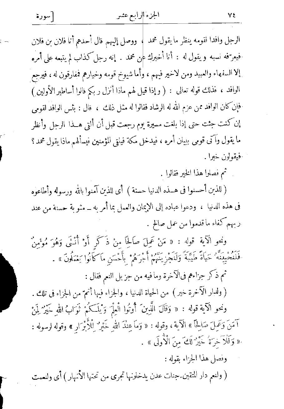 ونحو الآية قوله: «مَنْ عَمِلَ صالِحاً مِنْ ذَكَرٍ أَوْ أُنْثى وَهُوَ مُؤْمِنٌ فَلَنُحْيِيَنَّهُ حَياةً طَيِّبَةً وَلَنَجْزِيَنَّهُمْ أَجْرَهُمْ بِأَحْسَنِ ما كانُوا يَعْمَلُونَ» .