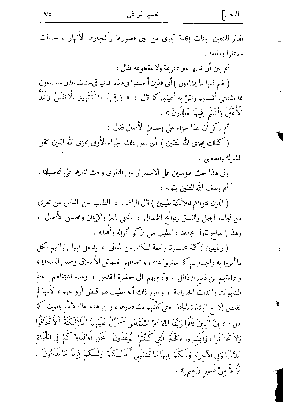 (الَّذِينَ تَتَوَفَّاهُمُ الْمَلائِكَةُ طَيِّبِينَ) قال الراغب: الطيب من الناس من تعرّى من نجاسة الجهل والفسق وقبائح الخصال، وتحلّى بالعلم والإيمان ومحاسن الأعمال، وهذا إيضاح لقول مجاهد: الطيب من تزكو أقواله وأفعاله.