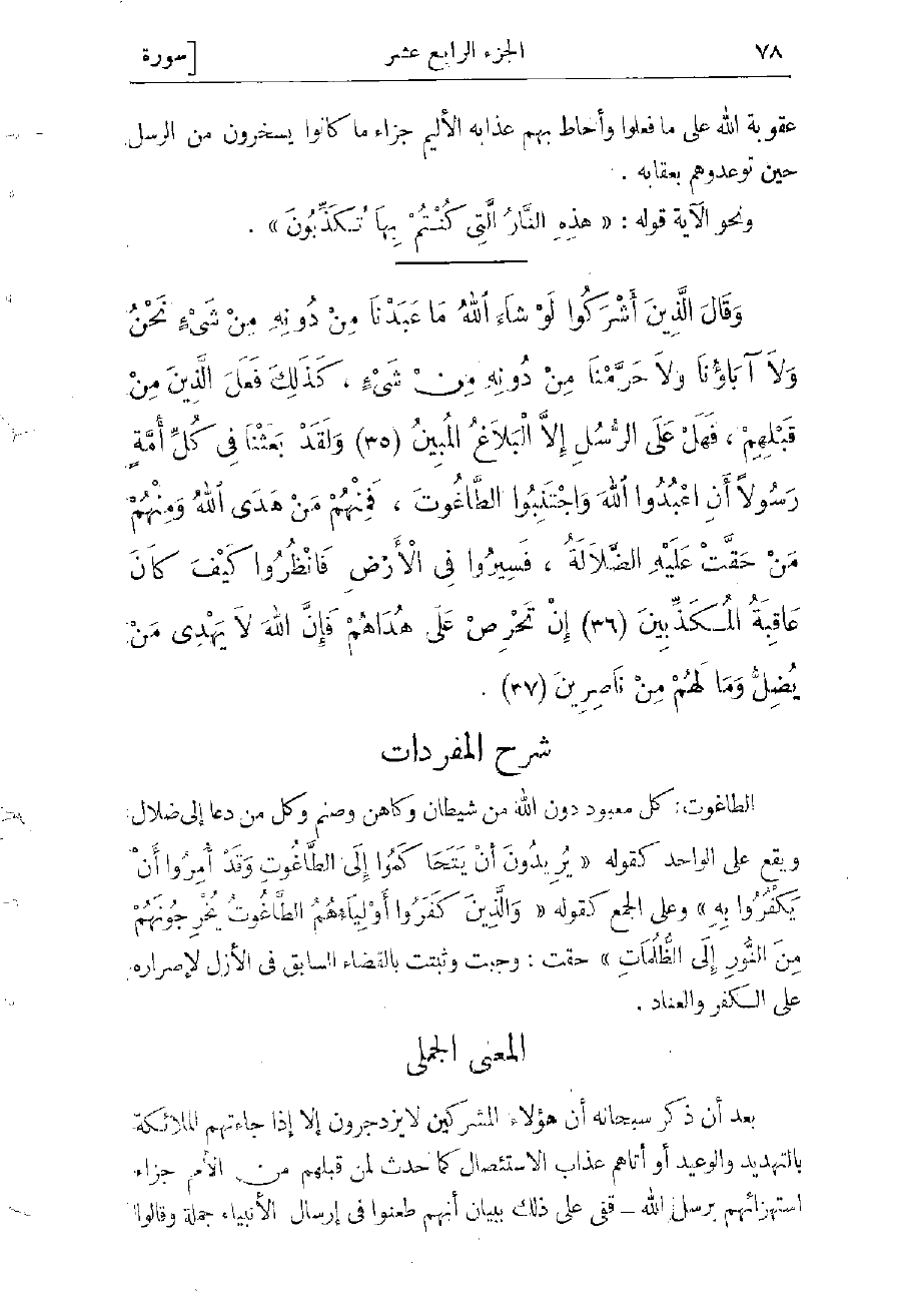 الطاغوت: كل معبود دون الله، من شيطان وكاهن وصنم وكل من دعا إلى ضلال، ويقع على الواحد كقوله «يُرِيدُونَ أَنْ يَتَحاكَمُوا إِلَى الطَّاغُوتِ وَقَدْ أُمِرُوا أَنْ يَكْفُرُوا بِهِ» وعلى الجمع كقوله: «وَالَّذِينَ كَفَرُوا أَوْلِياؤُهُمُ الطَّاغُوتُ يُخْرِجُونَهُمْ مِنَ النُّورِ إِلَى الظُّلُماتِ» حقت: وجبت وثبتت بالقضاء السابق فى الأزل، لإصراره على الكفر والعناد.