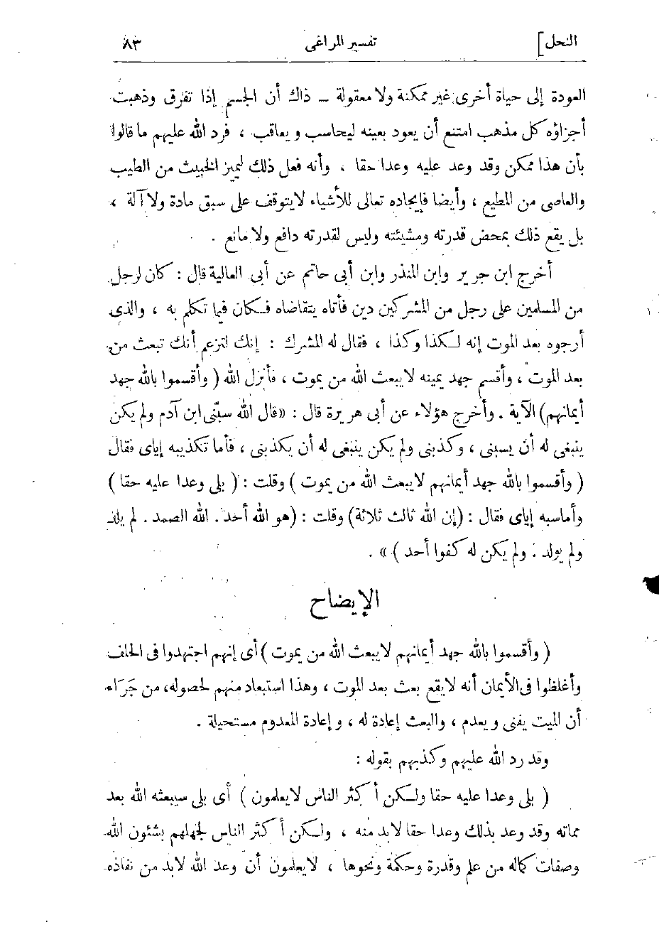 (وَأَقْسَمُوا بِاللَّهِ جَهْدَ أَيْمانِهِمْ لا يَبْعَثُ اللَّهُ مَنْ يَمُوتُ) أي إنهم اجتهدوا فى الحلف، وأغلظوا فى الأيمان، أنه لا يقع بعث بعد الموت، وهذا استبعاد منهم لحصوله، من جراء أن الميت يفنى ويعدم، والبعث إعادة له، وإعادة المعدوم مستحيلة.
