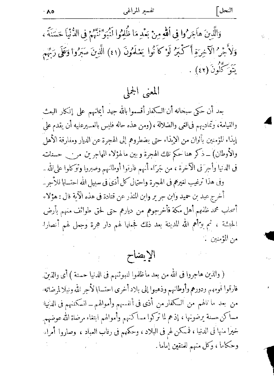 بعد أن حكى سبحانه أن الكفار أقسموا بالله جهد أيمانهم على إنكار البعث والقيامة، وتمادوا فى الغىّ والضلالة، (ومن هذه حاله فليس بالعسير عليه أن يقدم على إيذاء المؤمنين بألوان من الإيذاء، حتى يضطروهم إلى الهجرة عن الديار ومفارقة الأهل والأوطان) - ذكر هنا حكم تلك الهجرة وبين ما لهؤلاء المهاجرين من حسنات فى الدنيا وأجر فى الآخرة، من جراء أنهم فارقوا أوطانهم وصبروا وتوكلوا على الله.