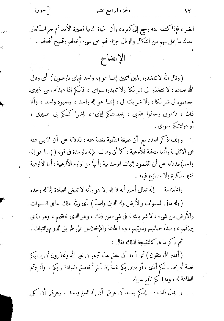 (وَقالَ اللَّهُ لا تَتَّخِذُوا إِلهَيْنِ اثْنَيْنِ إِنَّما هُوَ إِلهٌ واحِدٌ فَإِيَّايَ فَارْهَبُونِ) أي وقال الله لعباده: لا تتخذوا لى شريكا ولا تعبدوا سواى، فإنكم إذا عبدتم معى غيرى جعلتموه لى شريكا، ولا شريك لى، إنما هو إله واحد، ومعبود واحد، وأنا ذاك، فاتقونى وخافوا عقابى، بمعصيتكم إياى، بإشراككم بي غيرى، أو عبادتكم سواى.