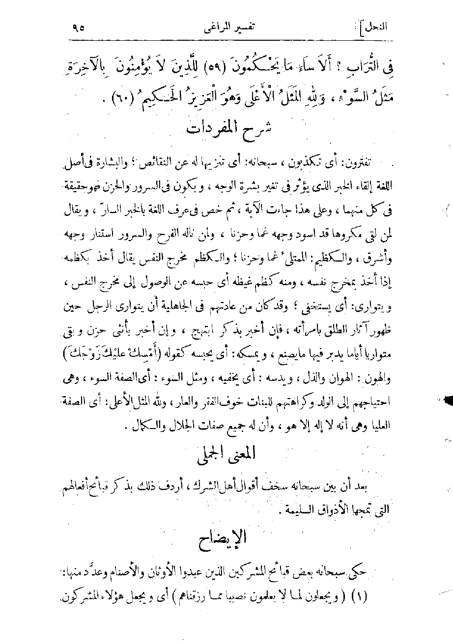 تفترون: أي تكذبون، سبحانه: أي تنزيها له عن النقائص والبشارة فى أصل اللغة إلقاء الخبر الذي يؤثّر فى تغير بشرة الوجه، ويكون فى السرور والحزن فهو حقيقة فى كل منهما، وعلى هذا جاءت الآية، ثم خص فى عرف اللغة بالخبر السارّ، ويقال لمن لقى مكروها قد اسودّ وجهه غما وحزنا، ولمن ناله الفرح والسرور استنار وجهه وأشرق، والكظيم: الممتلئ غما وحزنا والكظم مخرج النفس يقال أخذ بكظمه إذا أخذ بمخرج نفسه، ومنه كظم غيظه أي حبسه عن الوصول إلى مخرج النفس، ويتوارى: أي يستخفى وقد كان من عادتهم فى الجاهلية أن يتوارى الرجل حين ظهور آثار الطلق بامرأته، فإن أخبر بذكر ابتهج، وإن أخبر بأنثى حزن وبقي متواريا أياما يدبّر فيها ما يصنع، ويمسكه: أي يحبسه كقوله (أمسك عليك زوجك) والهون: