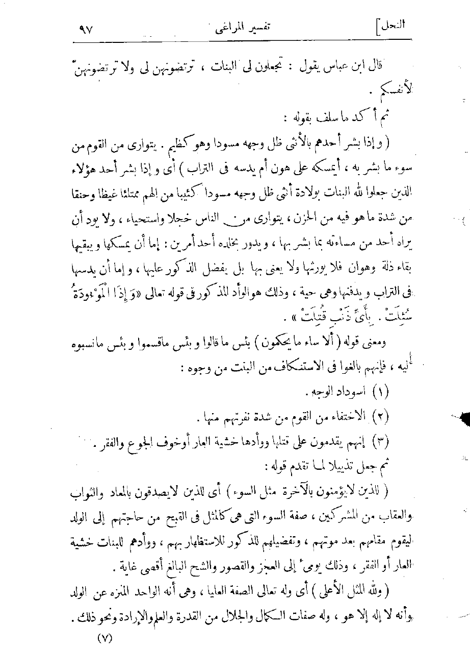 (وَإِذا بُشِّرَ أَحَدُهُمْ بِالْأُنْثى ظَلَّ وَجْهُهُ مُسْوَدًّا وَهُوَ كَظِيمٌ. يَتَوارى مِنَ الْقَوْمِ مِنْ سُوءِ ما بُشِّرَ بِهِ، أَيُمْسِكُهُ عَلى هُونٍ أَمْ يَدُسُّهُ فِي التُّرابِ) أي وإذا بشر أحد هؤلاء الذين جعلوا لله البنات بولادة أنثى ظل وجهه مسودا كئيبا من الهم ممتلئا غيظا وحنقا من شدة ما هو فيه من الحزن، يتوارى من الناس حجلا واستحياء: ولا يود أن يراه أحد من مساءته بما بشر بها، ويدور بخلده أحد أمرين: إما أن يمسكها ويبقيها بقاء ذلة وهوان فلا يورّثها ولا يعنى بها، بل يفضّل الذكور عليها، وإما أن يدسها فى التراب ويدفنها وهى حية، وذلك هو الوأد المذكور فى قوله تعالى «وَإِذَا الْمَوْؤُدَةُ سُئِلَتْ. بِأَيِّ ذَنْبٍ قُتِلَتْ» .