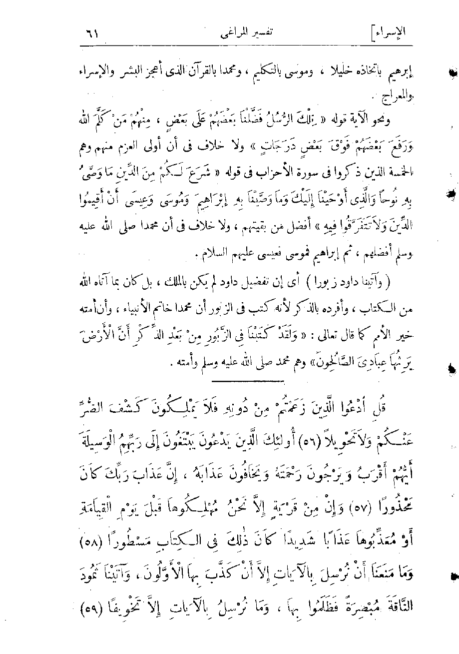 إبراهيم باتخاذه خليلا، وموسى بالتكليم، ومحمدا بالقرآن الذي أعجز البشر والإسراء والمعراج.