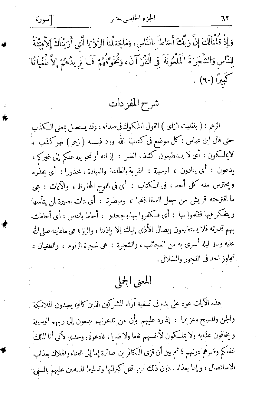 أي لا يستطيعون، كشف الضر: إزالته أو تحويله عنكم إلى غيركم، يدعون: أي ينادون، الوسيلة: القرب بالطاعة والعبادة، محذورا: أي يحذره ويحترس منه كل أحد، فى الكتاب: أي فى اللوح المحفوظ، والآيات: هى ما اقترحته قريش من جعل الصفا ذهبا، ومبصرة: أي ذات بصيرة لمن يتأملها ويتفكر فيها، فظلموا بها: أي فكفروا بها وجحدوا، أحاط بالناس: أي أحاطت بهم قدرته فلا يستطيعون إيصال الأذى إليك إلا بإذننا، والرؤيا هى ما عاينه صلى الله عليه وسلّم ليلة أسرى به من العجائب، والشجرة: