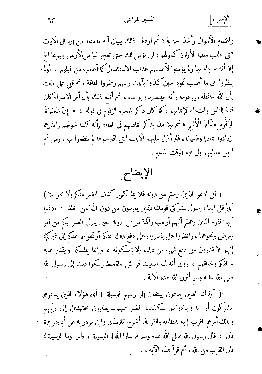 واغتنام الأموال وأخذ الجزية ثم أردف ذلك ببيان أنه ما منعه من إرسال الآيات التي طلب مثلها الأولون كقولهم: «لَنْ نُؤْمِنَ لَكَ حَتَّى تَفْجُرَ لَنا مِنَ الْأَرْضِ يَنْبُوعاً» إلخ إلا أنه لو جاء بها ولم يؤمنوا لأصابهم عذاب الاستئصال كما أصاب من قبلهم، أولم ينظروا إلى ما أصاب ثمود حين كذبوا بآيات ربهم وعقروا الناقة، ثم قفى على ذلك بأن الله حافظه من قومه، وأنه سينضره ويؤيده، ثم أتبع ذلك بأن أمر الإسراء كان فتنة للناس وامتحانا لإيمانهم، كما كان ذكر شجرة الزقوم فى قوله: «إِنَّ شَجَرَةَ الزَّقُّومِ طَعامُ الْأَثِيمِ» ثم تلا هذا بذكر تماديهم فى العناد، وأنه كلما خوّفهم وأنذرهم ازدادوا تماديا وطغيانا، فلو أنزل عليهم الآيات التي اقترحوها لم ينتفعوا بها، ومن ثم أجّل عذابهم إلى يوم الوقت المعلوم.