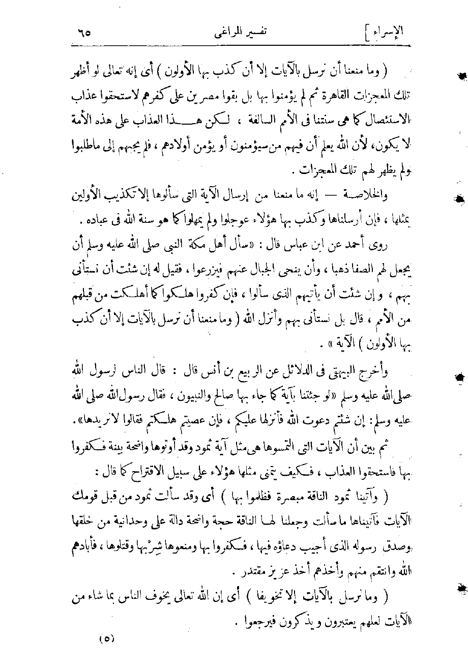 وأخرج البيهقي فى الدلائل عن الربيع بن أنس قال: قال الناس لرسول الله صلى الله عليه وسلّم «لو جئتنا بآية كما جاء بها صالح والنبيون، فقال رسول الله صلى الله عليه وسلّم إن شئتم دعوت الله فأنزلها عليكم، فإن عصيتم هلكتم فقالوا لا نريدها» .