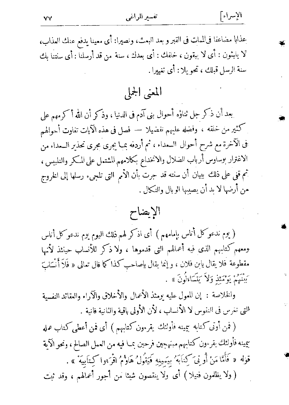 بعد أن ذكر جل ثناؤه أحوال بنى آدم فى الدنيا، وذكر أنه أكرمهم على كثير من خلقه، وفضلهم عليهم تفضيلا- فصّل فى هذه الآيات تفاوت أحوالهم فى الآخرة مع شرح أحوال السعداء، ثم أردفه ما يجرى مجرى تحذير السعداء من الاغترار بوساوس أرباب الضلال، والانخداع بكلامهم المشتمل على المكر والتلبيس، ثم قفى على ذلك ببيان أن سنته قد جرت بأن الأمم التي تلجىء رسلها إلى الخروج من أرضها لا بد أن يصيبها الوبال والنكال.