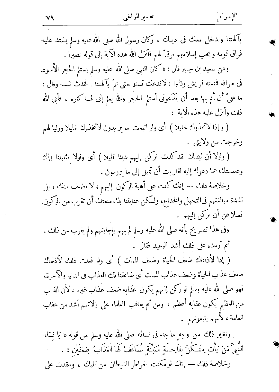 (إِذاً لَأَذَقْناكَ ضِعْفَ الْحَياةِ وَضِعْفَ الْمَماتِ) أي ولو فعلت ذلك لأذقناك ضعف عذاب الحياة وضعف عذاب الممات: أي ضاعفنا لك العذاب فى الدنيا والآخرة، فهو صلى الله عليه وسلّم لو ركن إليهم يكون عذابه ضعف عذاب غيره، لأن الذنب من العظيم يكون عقابه أعظم، ومن ثم يعاقب العلماء على زلاتهم أشد من عقاب العامة لأنهم يتبعونهم.