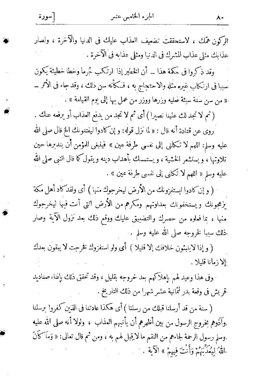 روى عن قتادة أنه قال: «لما نزل قوله: وإن كادوا ليفتنونك إلخ قال صلى الله عليه وسلّم: اللهم لا تكلنى إلى نفسى طرفة عين»