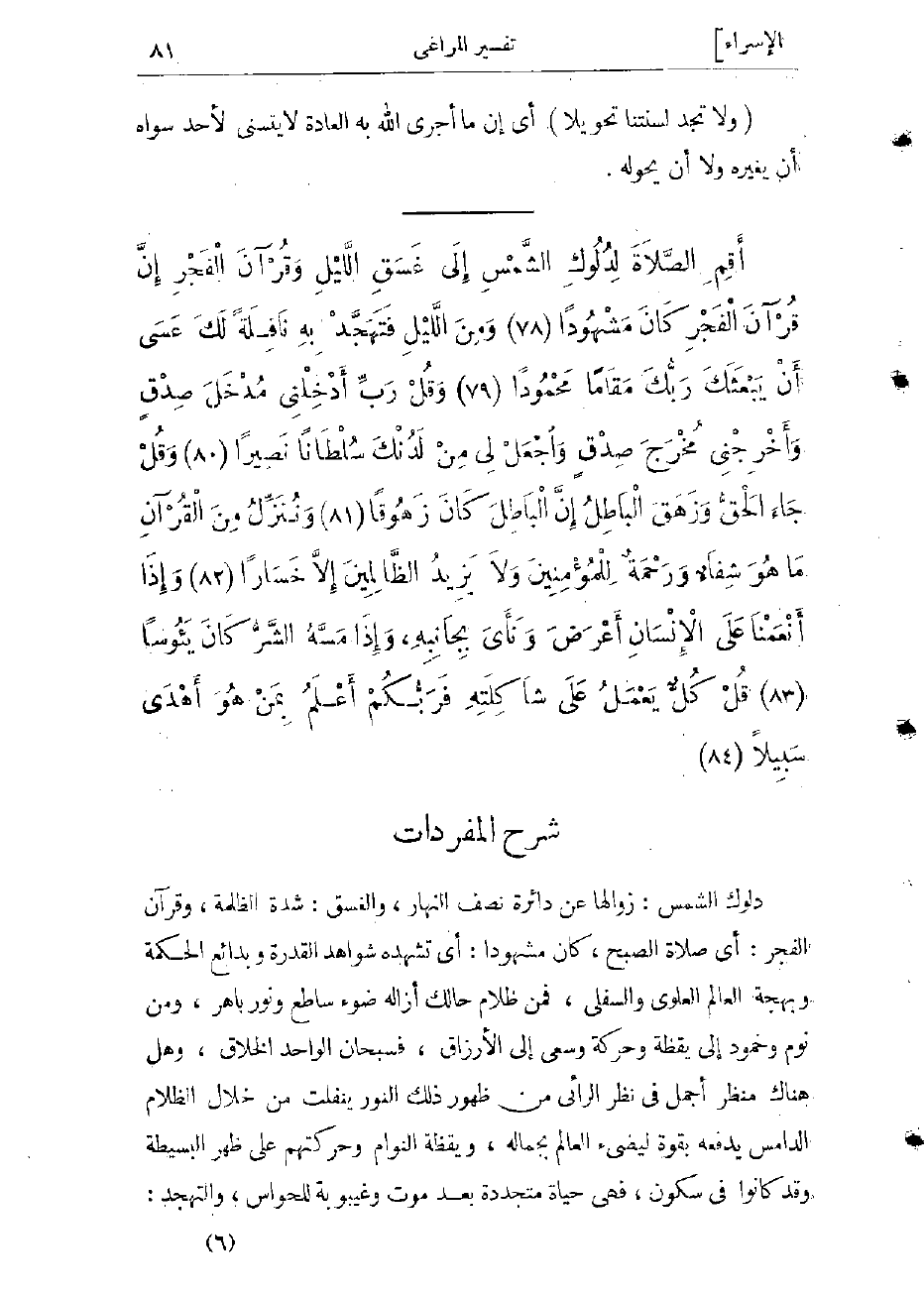 دلوك الشمس: زوالها عن دائرة نصف النهار، والغسق: شدة الظلمة، وقرآن الفجر: أي صلاة الصبح، كان مشهودا: أي تشهده شواهد القدرة، وبدائع الحكمة، وبهجة العالم العلوي والسفلى فمن ظلام حالك، أزاله ضوء ساطع، ونور باهر، ومن نوم وخمود، إلى يقظة وحركة، وسعى إلى الأرزاق، فسبحان الواحد الخلاق، وهل هناك منظر أجمل فى نظر الرائي من ظهور ذلك النور ينفلت من خلال الظلام الدامس يدفعه بقوة، ليضىء العالم بجماله، ويقظة النّوّام وحركتهم على ظهر البسيطة، وقد كانوا فى سكون، فهى حياة متجددة بعد موت وغيبوبة للحواس، والتهجد: