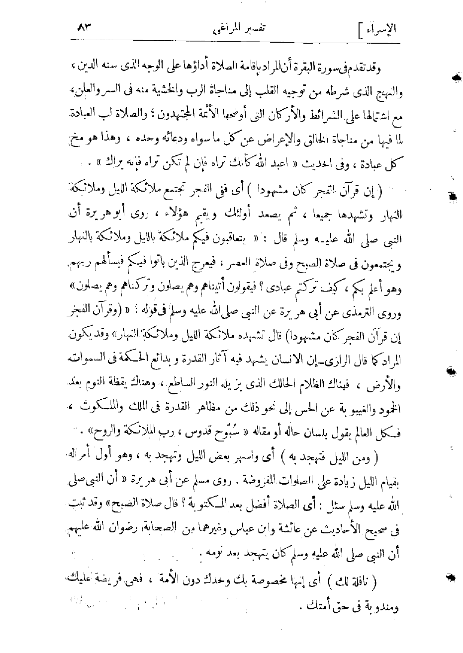 وروى الترمذي عن أبى هريرة عن النبي صلى الله عليه وسلّم فى قوله: « (وَقُرْآنَ الْفَجْرِ إِنَّ قُرْآنَ الْفَجْرِ كانَ مَشْهُوداً) قال تشهده ملائكة الليل وملائكة النهار»