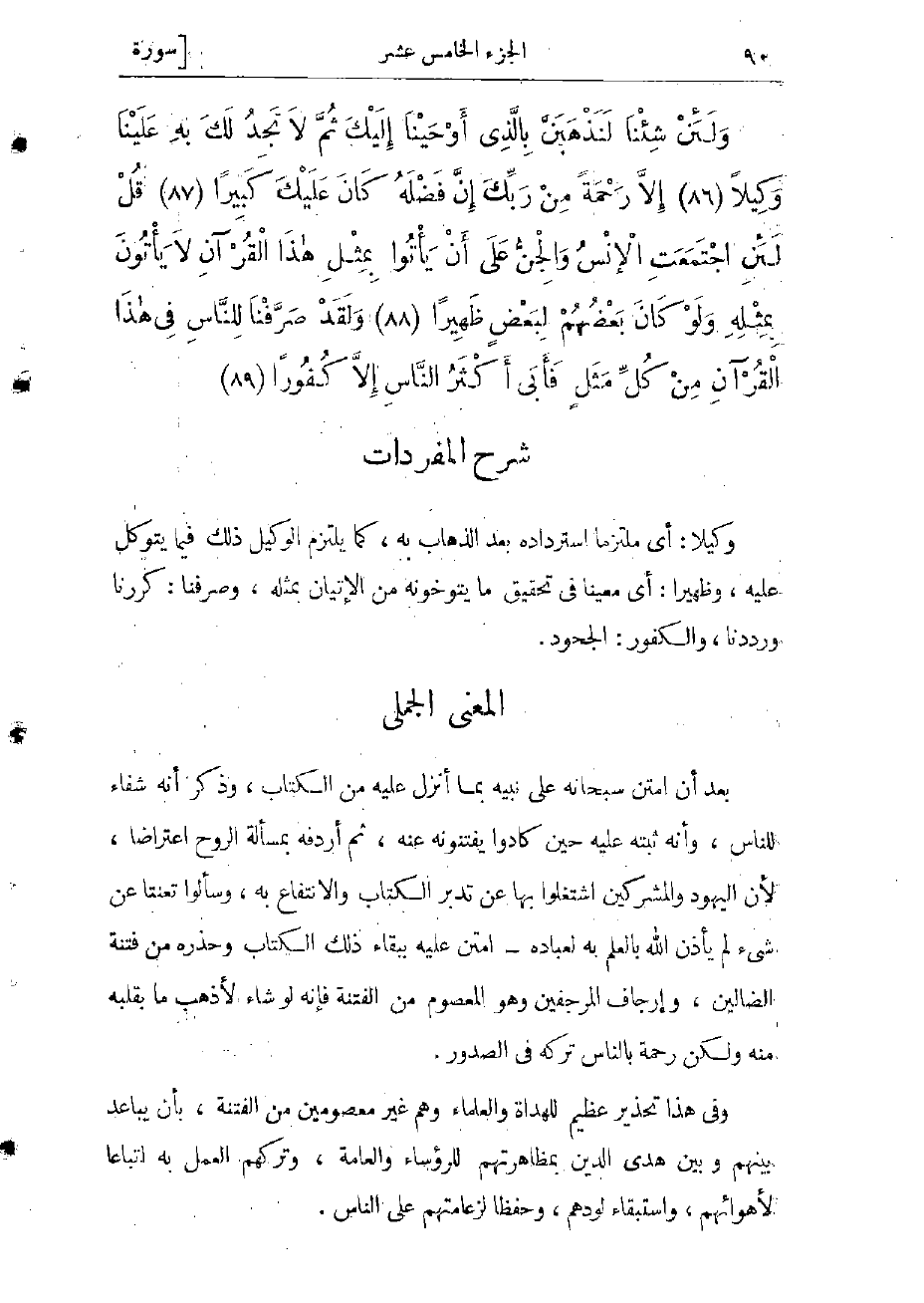 ثم ذكر أن القرآن وحي يوحى فلا يستطيع الجن والإنس أن يأتوا بمثله ولو كان بعضهم لبعض معينا، وقد اشتمل على الحكم والأحكام والآداب التي يحتاج إليها البشر فى معاشهم ومعادهم، وكثير من الناس جحدوا فضله عتوا وكبرا.