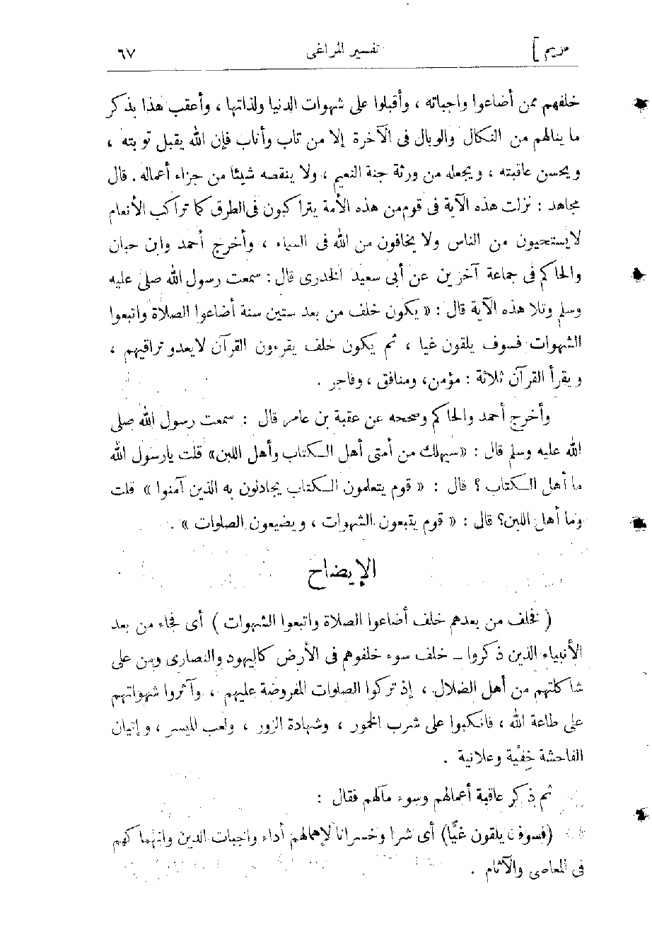 خلفهم ممن أضاعوا واجباته، وأقبلوا على شهوات الدنيا ولذاتها، وأعقب هذا بذكر ما ينالهم من النكال والوبال فى الآخرة إلا من تاب وأناب، فإن الله يقبل توبته، ويحسن عاقبته، ويجعله من ورثة جنة النعيم، ولا ينقصه شيئا من جزاء أعماله. قال مجاهد: نزلت هذه الآية فى قوم من هذه الأمة يتراكبون فى الطرق كما تراكب الأنعام، لا يستحيون من الناس، ولا يخافون من الله فى السماء.
