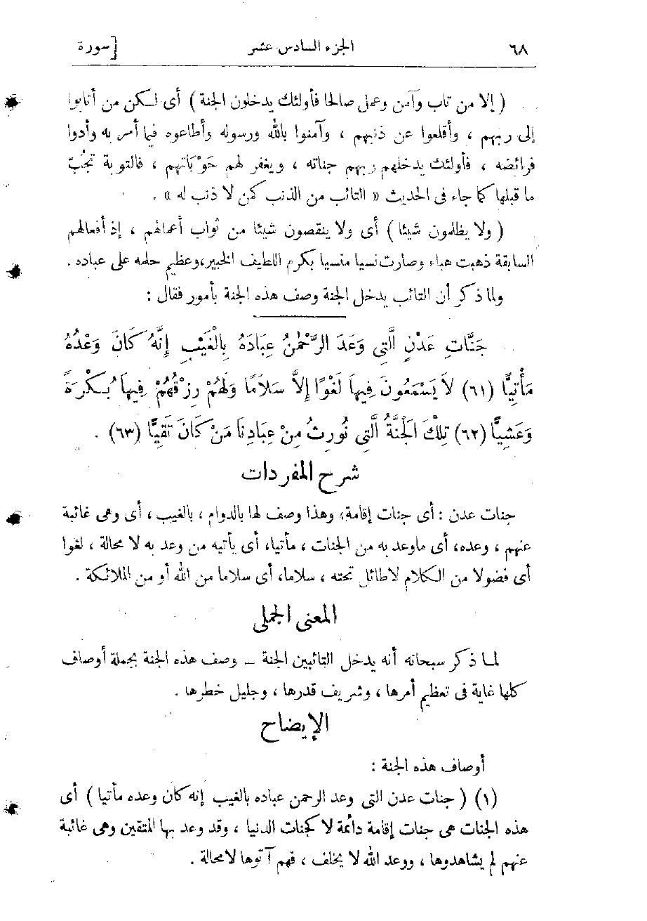 (1) (جنات عدن التى وعد الرحمن عباده بالغيب إنه كان وعده مأتيا) أي هذه الجنات هى جنات إقامة دائمة لا كجنات الدنيا، وقد وعد بها المتقين وهى غائبة عنهم لم يشاهدوها، ووعد الله لا يخلف، فهم آتوها لا محالة.