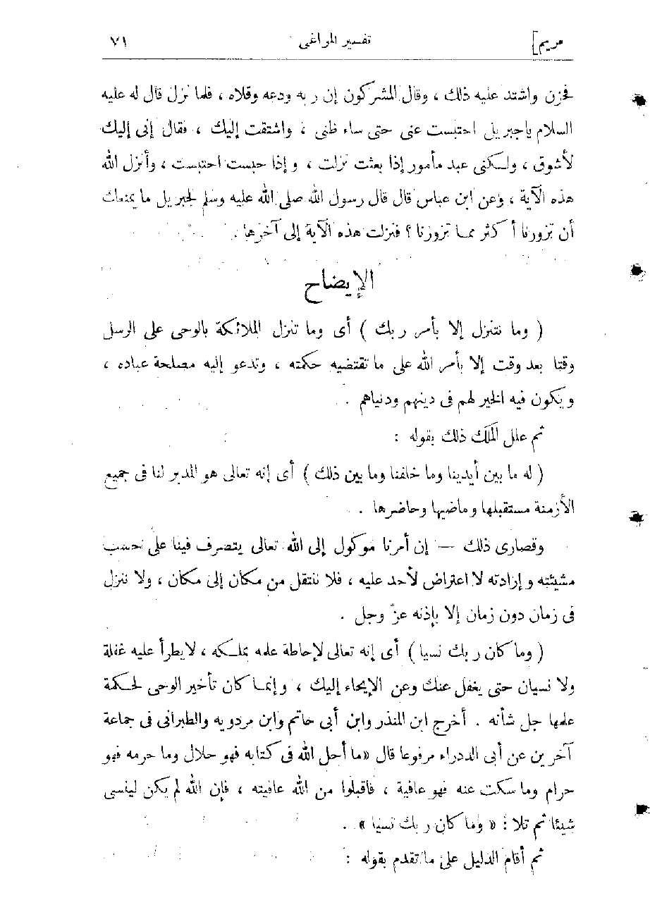 وعن ابن عباس قال: قال رسول الله صلّى الله عليه وسلّم لجبريل «ما يمنعك أن تزورنا أكثر مما تزورنا؟ فنزلت هذه الآية إلى آخرها» .