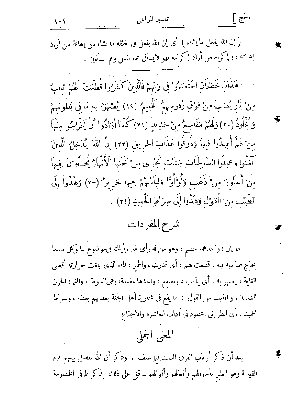 خصمان: واحدهما خصم، وهو من له رأى غير رأيك فى موضوع ما، وكل منهما يحاجّ صاحبه فيه، قطعت لهم: أي قدّرت، والحميم: الماء الذي بلغت حرارته أقصى الغاية، يصهر به: أي يذاب، ومقامع: واحدها مقمعة، وهى السوط، والغم: الحزن الشديد، والطيّب من القول: ما يقع فى محاورة أهل الجنة بعضهم بعضا، وصراط الحميد: