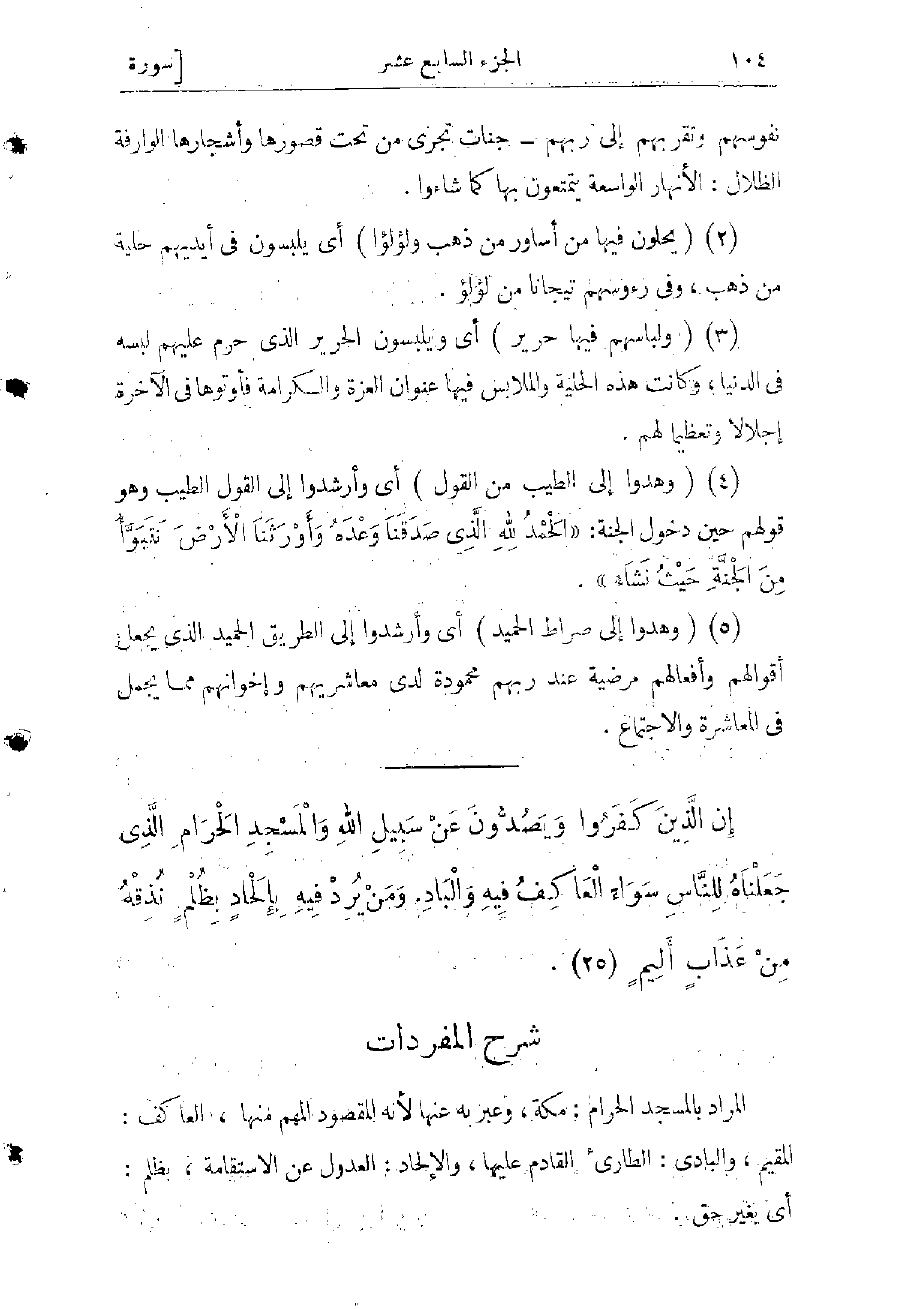 المراد بالمسجد الحرام: مكة، وعبر به عنها لأنه المقصود المهم منها، العاكف: المقيم، والبادي: الطارئ القادم عليها، والإلحاد: العدول عن الاستقامة، بظلم: أي بغير حق.