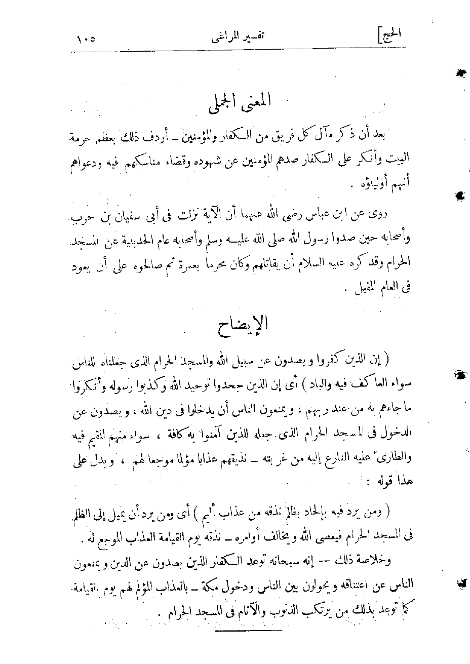 (إِنَّ الَّذِينَ كَفَرُوا وَيَصُدُّونَ عَنْ سَبِيلِ اللَّهِ وَالْمَسْجِدِ الْحَرامِ الَّذِي جَعَلْناهُ لِلنَّاسِ سَواءً الْعاكِفُ فِيهِ وَالْبادِ) أي إن الذين جحدوا توحيد الله وكذبوا رسوله وأنكروا ما جاءهم به من عند ربهم، ويمنعون الناس أن يدخلوا فى دين الله، ويصدون عن الدخول فى المسجد الحرام الذي جعله للذين آمنوا به كافة، سواء منهم المقيم فيه والطارئ عليه النازع إليه من غربته- نذيقهم عذابا مؤلما موجعا لهم، ويدل على هذا قوله: