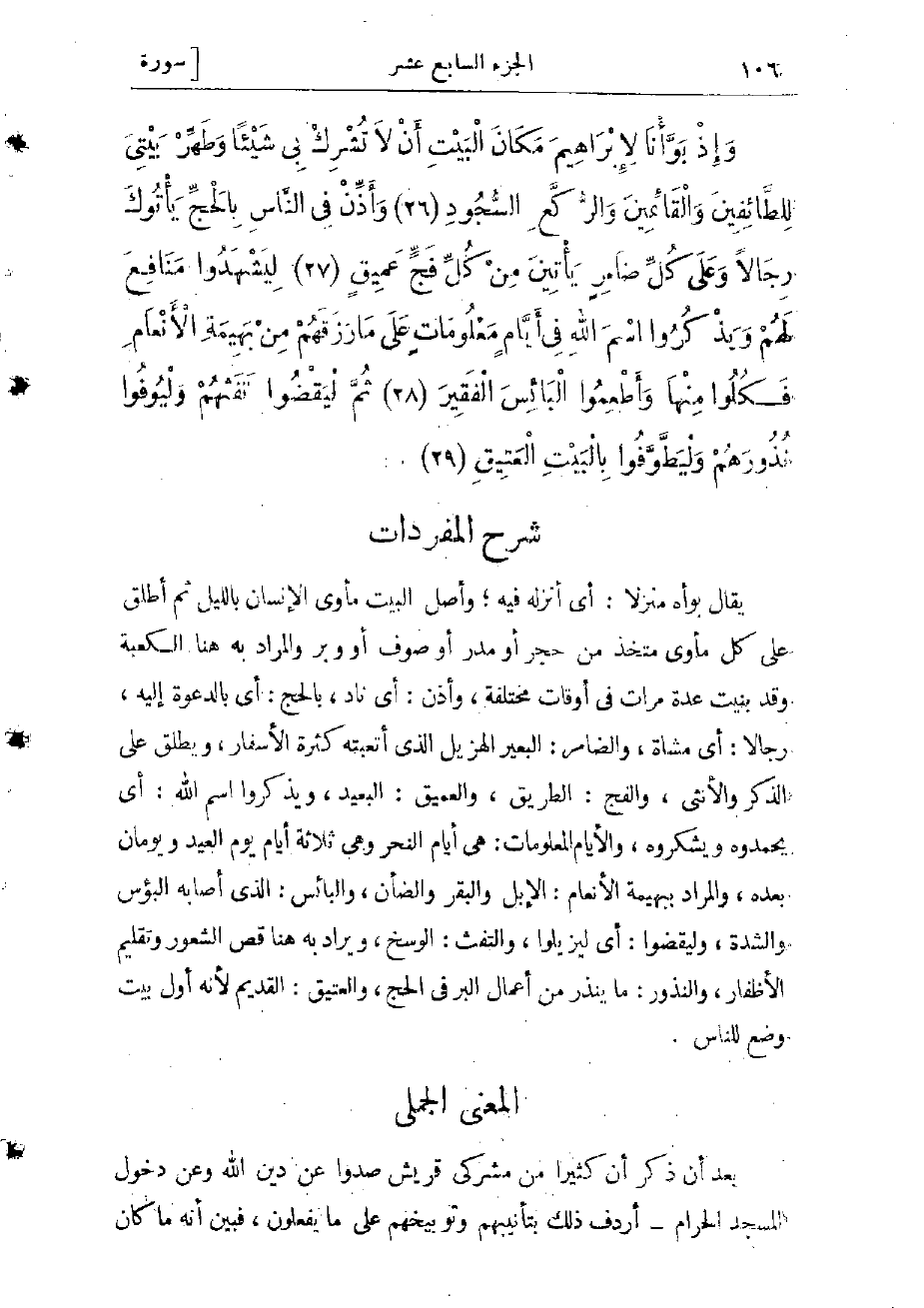 أي مشاة، والضامر: البعير الهزيل الذي أتعبته كثرة الأسفار، ويطلق على الذكر والأنثى، والفج: الطريق، والعميق: البعيد، ويذكروا اسم الله: أي يحمدوه ويشكروه، والأيام المعلومات: هى أيام النحر وهى ثلاثة أيام يوم العيد ويومان بعده، والمراد ببهيمة الأنعام: الإبل والبقر والضأن، والبائس: الذي أصابه البؤس والشدة، وليقضوا: أي ليزيلوا، والتفث: الوسخ، ويراد به هنا قص الشعور وتقليم الأظفار، والنذور: ما ينذر من أعمال البر في الحج، والعتيق: القديم لأنه أول بيت وضع للناس.