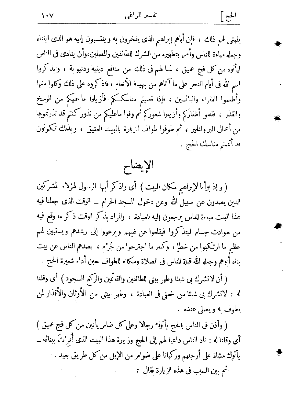 ينبغى لهم ذلك، فإن أباهم إبراهيم الذي يفخرون به وينتسبون إليه هو الذي ابتناه وجعله مباءة للناس وأمر بتطهيره من الشرك للطائفين والمصلين، وأن ينادى فى النّاس ليأتوه من كل فج عميق، لما لهم فى ذلك من منافع دينية ودنيوية، ويذكروا اسم الله فى أيام النحر على ما آتاهم من بهيمة الأنعام، فاذكروه على ذلك، وكلوا منها، وأطعموا الفقراء والبائسين، فإذا قضيتم مناسككم فأزيلوا ما عليكم من الوسخ والقذر، فقلّموا أظفاركم وأزيلوا شعوركم، ثم وفّوا ما عليكم من نذور كنتم قد نذرتموها من أعمال البر والخير، ثم طوفوا طواف الزيارة بالبيت العتيق، وبذلك تكونون قد أتممتم مناسك الحج.