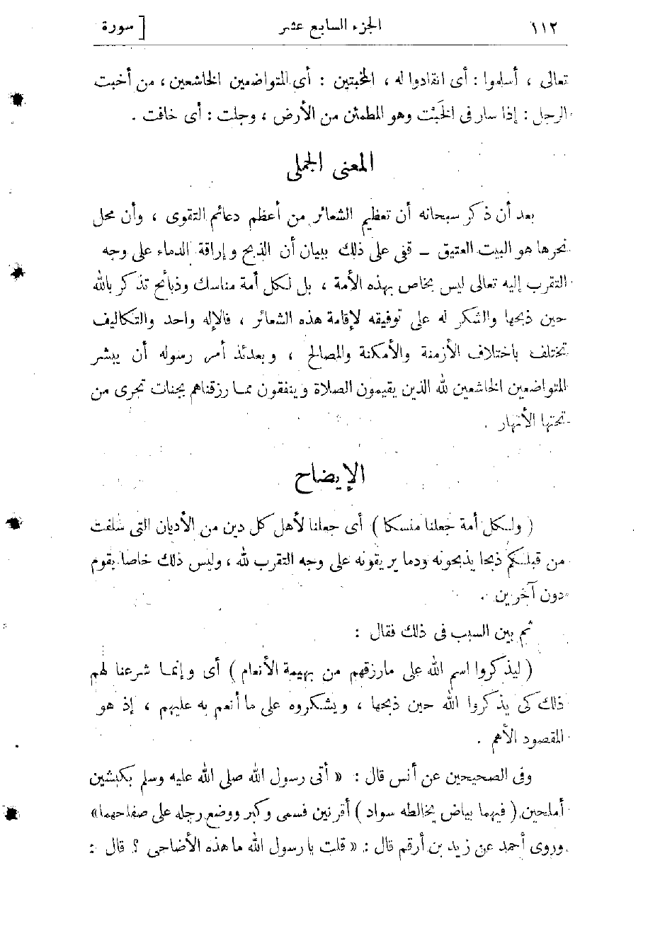 بعد أن ذكر سبحانه أن تعظيم الشعائر من أعظم دعائم التقوى، وأن محل نحرها هو البيت العتيق- قفىّ على ذلك ببيان أن الذبح وإراقة الدماء على وجه التقرب إليه تعالى ليس بخاص بهذه الأمة، بل لكل أمة مناسك وذبائح تذكر بالله حين ذبحها والشكر له على توفيقه لإقامة هذه الشعائر، فالإله واحد والتكاليف تختلف باختلاف الأزمنة والأمكنة والمصالح، وبعدئذ أمر رسوله أن يبشر المتواضعين الخاشعين لله الذين يقيمون الصلاة وينفقون مما رزقناهم بجنات تجرى من تحتها الأنهار.
