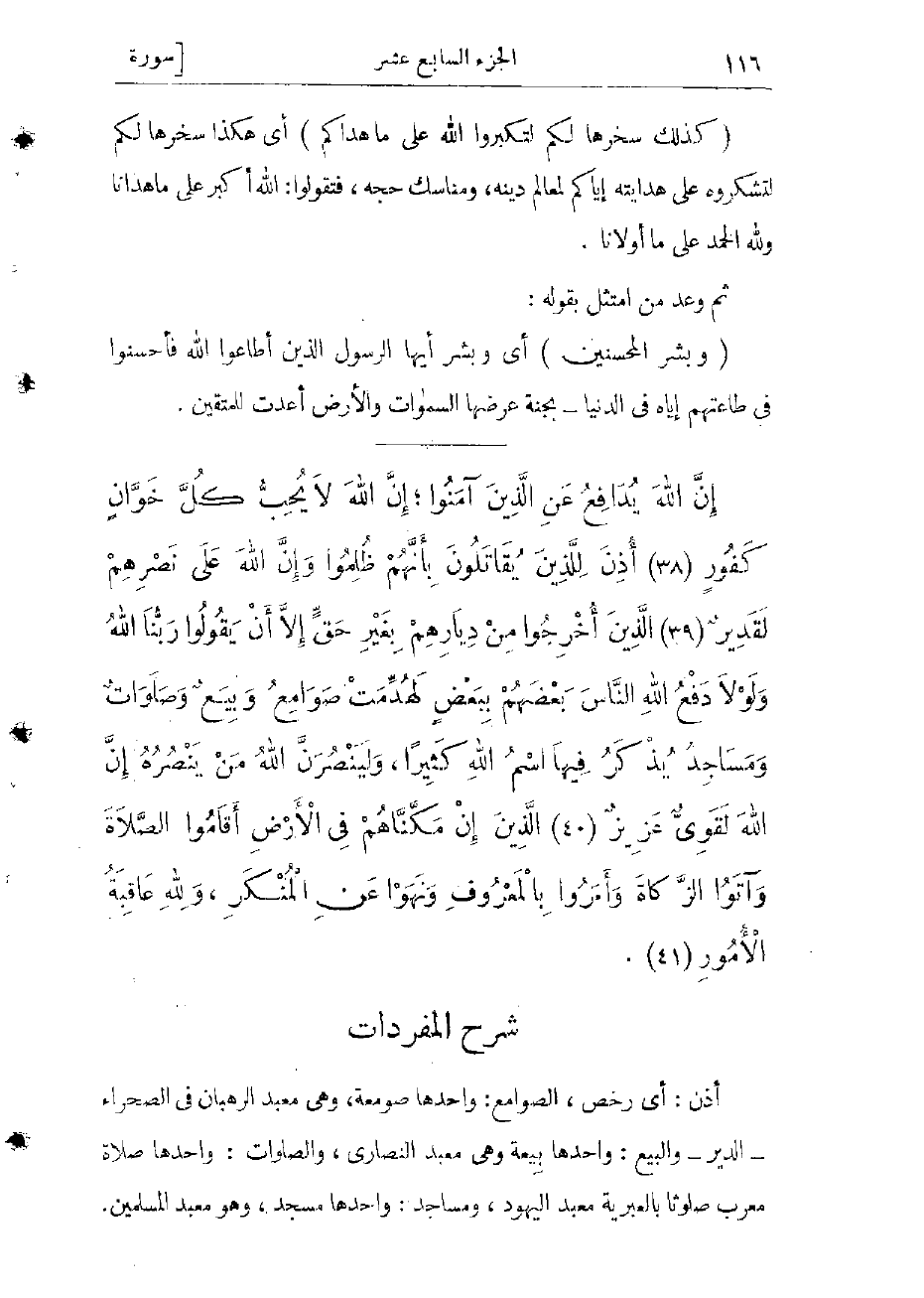 أذن: أي رخّص، الصوامع: واحدها صومعة، وهى معبد الرهبان فى الصحراء- الدير- والبيع: واحدها بيعة وهى معبد النصارى، والصلوات: واحدها صلاة معرّب صلوثا بالعبرية معبد اليهود، ومساجد: واحدها مسجد، وهو معبد المسلمين.