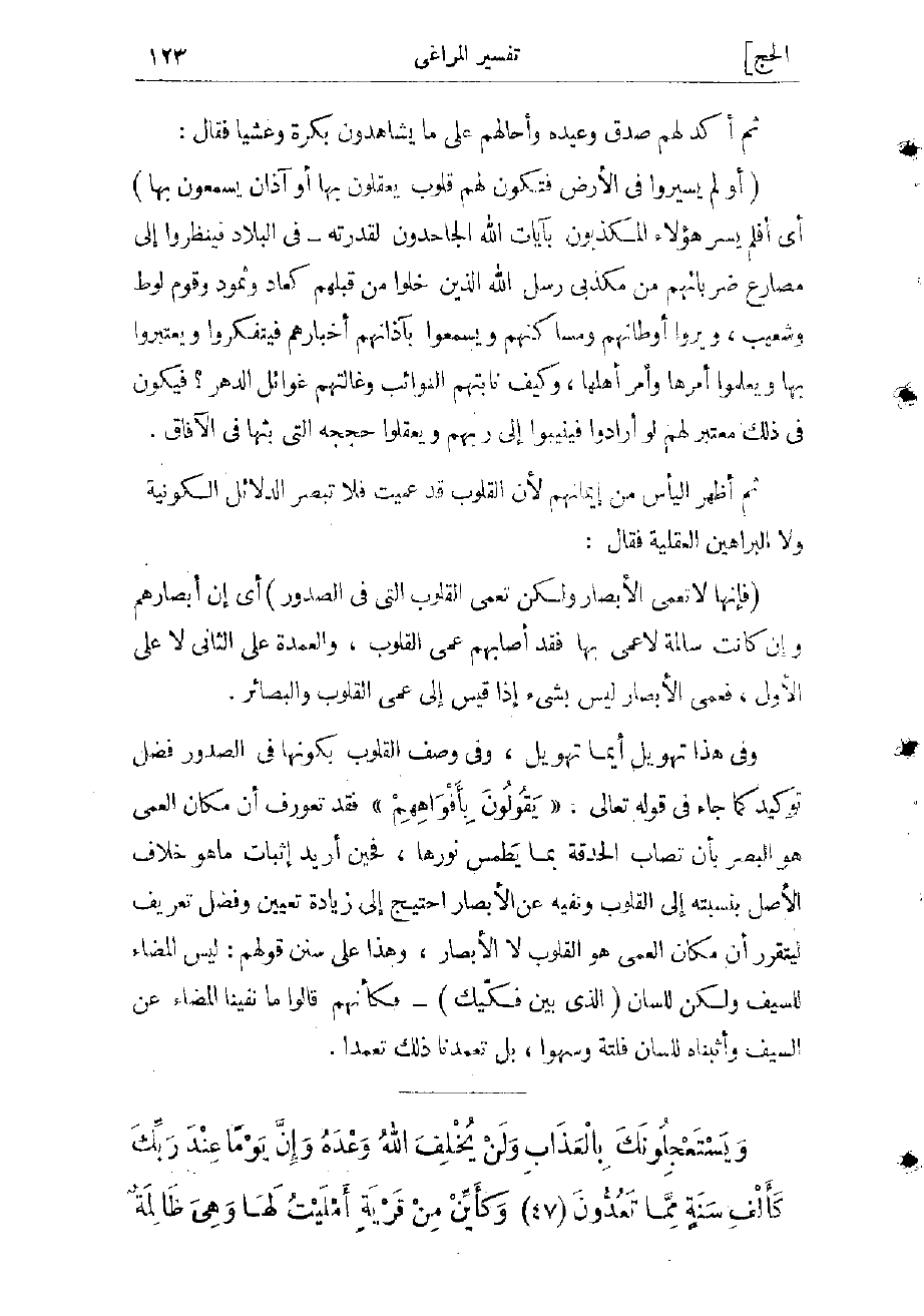 (فَإِنَّها لا تَعْمَى الْأَبْصارُ وَلكِنْ تَعْمَى الْقُلُوبُ الَّتِي فِي الصُّدُورِ) أي إن أبصارهم وإن كانت سالمة لا عمى بها فقد أصابهم عمى القلوب، والعمدة على الثاني لا على الأول، فعمى الأبصار ليس بشىء إذا قيس بعمى القلوب والبصائر.