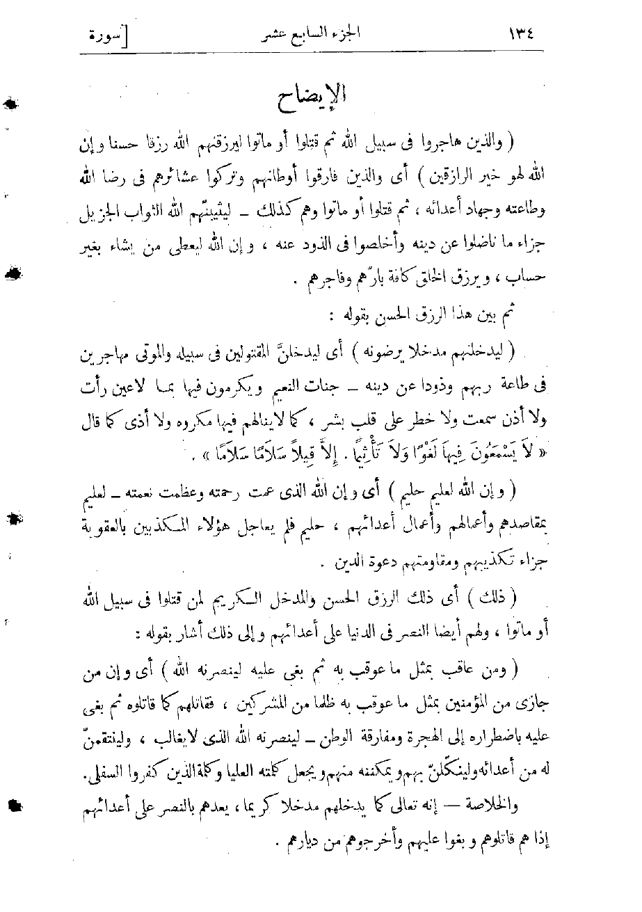 (وَالَّذِينَ هاجَرُوا فِي سَبِيلِ اللَّهِ ثُمَّ قُتِلُوا أَوْ ماتُوا لَيَرْزُقَنَّهُمُ اللَّهُ رِزْقاً حَسَناً وَإِنَّ اللَّهَ لَهُوَ خَيْرُ الرَّازِقِينَ) أي والذين فارقوا أوطانهم، وتركوا عشائرهم، فى رضا الله وطاعته وجهاد أعدائه، ثم قتلوا أو ماتوا وهم كذلك- ليثيبنّهم الله الثواب الجزيل جزاء ما ناضلوا عن دينه، وأخلصوا فى الذود عنه، وإن الله ليعطى من يشاء بغير حساب، ويرزق الخلق كافة بارّهم وفاجرهم.