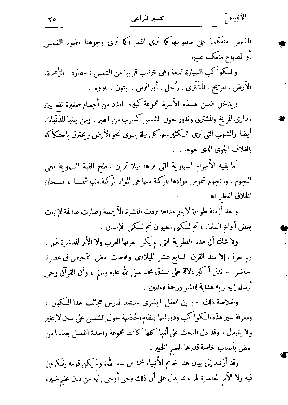 وخلاصة ذلك- إن العقل البشرى مستعد لدرس عجائب هذا الكون، ومعرفة سير هذه الكواكب ودورانها بنظام الجاذبية حول الشمس على سنن لا يتغير ولا يتبدل، وقد دل البحث على أنها كلها كانت مجموعة واحدة انفصل بعضها من بعض بأسباب خاصة قدّرها العليم الخبير.