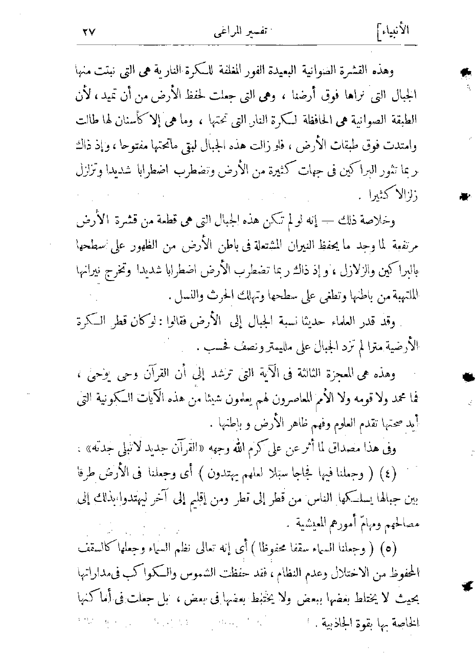 وخلاصة ذلك- إنه لو لم تكن هذه لجبال التي هى قطعة من قشرة الأرض مرتفعة لما وجد ما يحفظ النيران المشتعلة فى باطن الأرض من الظهور على سطحها بالبراكين والزلازل، وإذ ذاك ربما تضطرب الأرض اضطرابا شديدا وتخرج نيرانها الملتهبة من باطنها وتطغى على سطحها وتهلك الحرث والنسل.