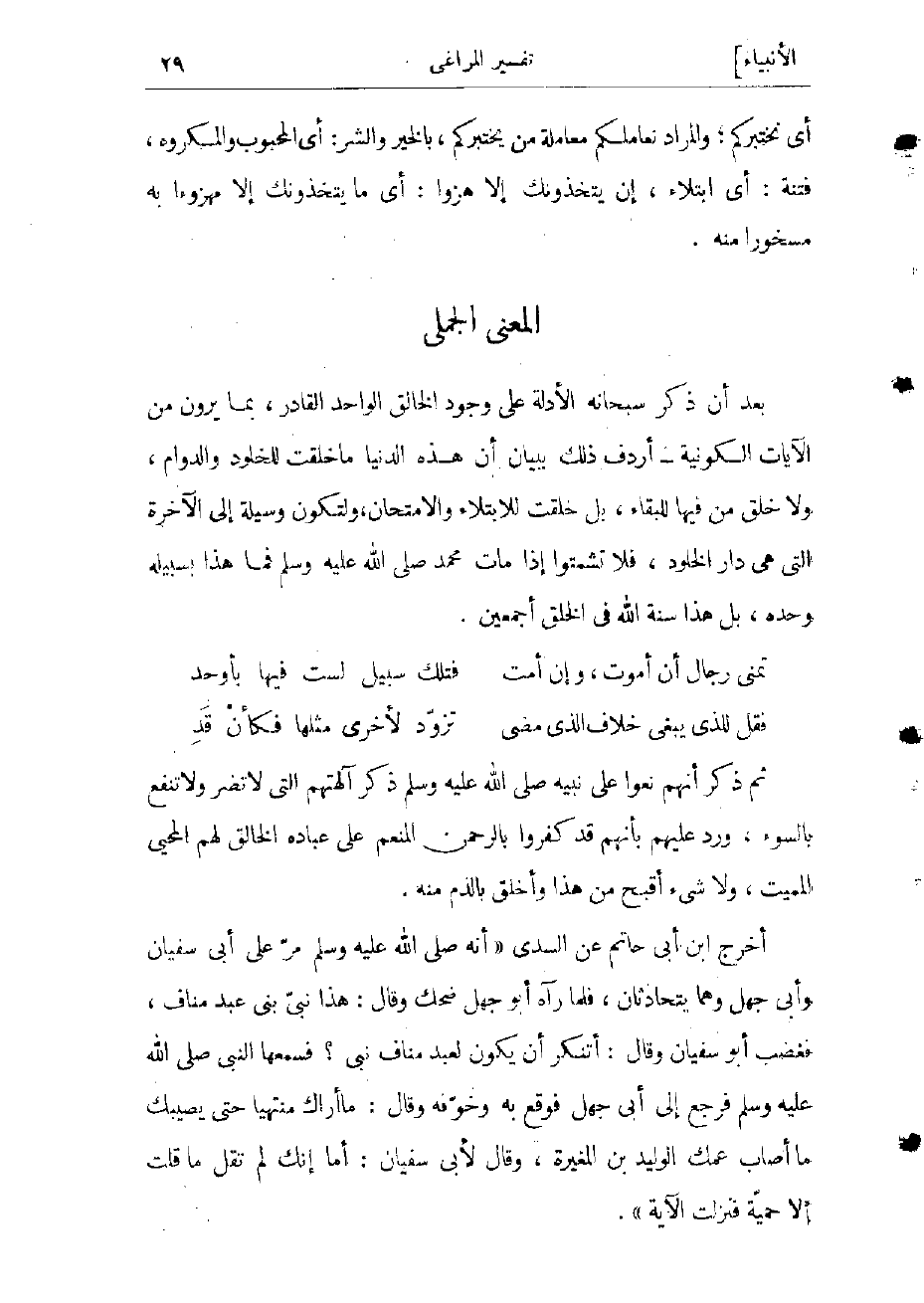 أخرج ابن أبى حاتم عن السدى «أنه صلّى الله عليه وسلّم مرّ على أبى سفيان وأبى جهل وهما يتحادثان، فلما رآه أبو جهل ضحك وقال: هذا نبىّ بنى عبد مناف، فغضب أبو سفيان وقال: أتنكر أن يكون لعبد مناف نبى؟ فسمعها النبي صلّى الله عليه وسلّم فرجع إلى أبى جهل فوقع به وخوّفه وقال: ما أراك منتهيا حتى يصيبك ما أصاب عمك الوليد بن المغيرة، وقال لأبى سفيان: أما إنك لم تقل ما قلت إلا حميّة، فنزلت الآية» .