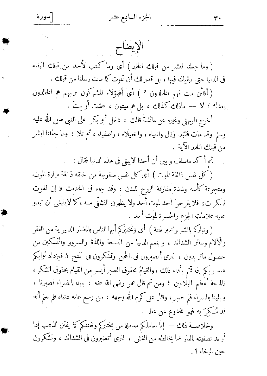 (وَما جَعَلْنا لِبَشَرٍ مِنْ قَبْلِكَ الْخُلْدَ) أي وما كتب لأحد من قبلك البقاء فى الدنيا حتى نبقيك فيها، بل قدّر لك أن تموت كما مات رسلنا من قبلك.