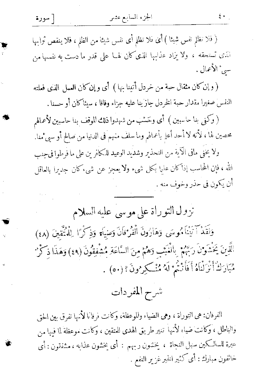 الفرقان: هى التوراة، وهى الضياء والموعظة، وكانت فرقانا، لأنها تفرق بين الحق والباطل، وكانت ضياء لأنها تنير طريق الهدى للمتقين، وكانت موعظة لما فيها من عبرة للسالكين سبل النجاة، يخشون ربهم: أي يخشون عذابه، مشفقون. أي خائفون، مبارك: أي كثير الخير غزير النفع.