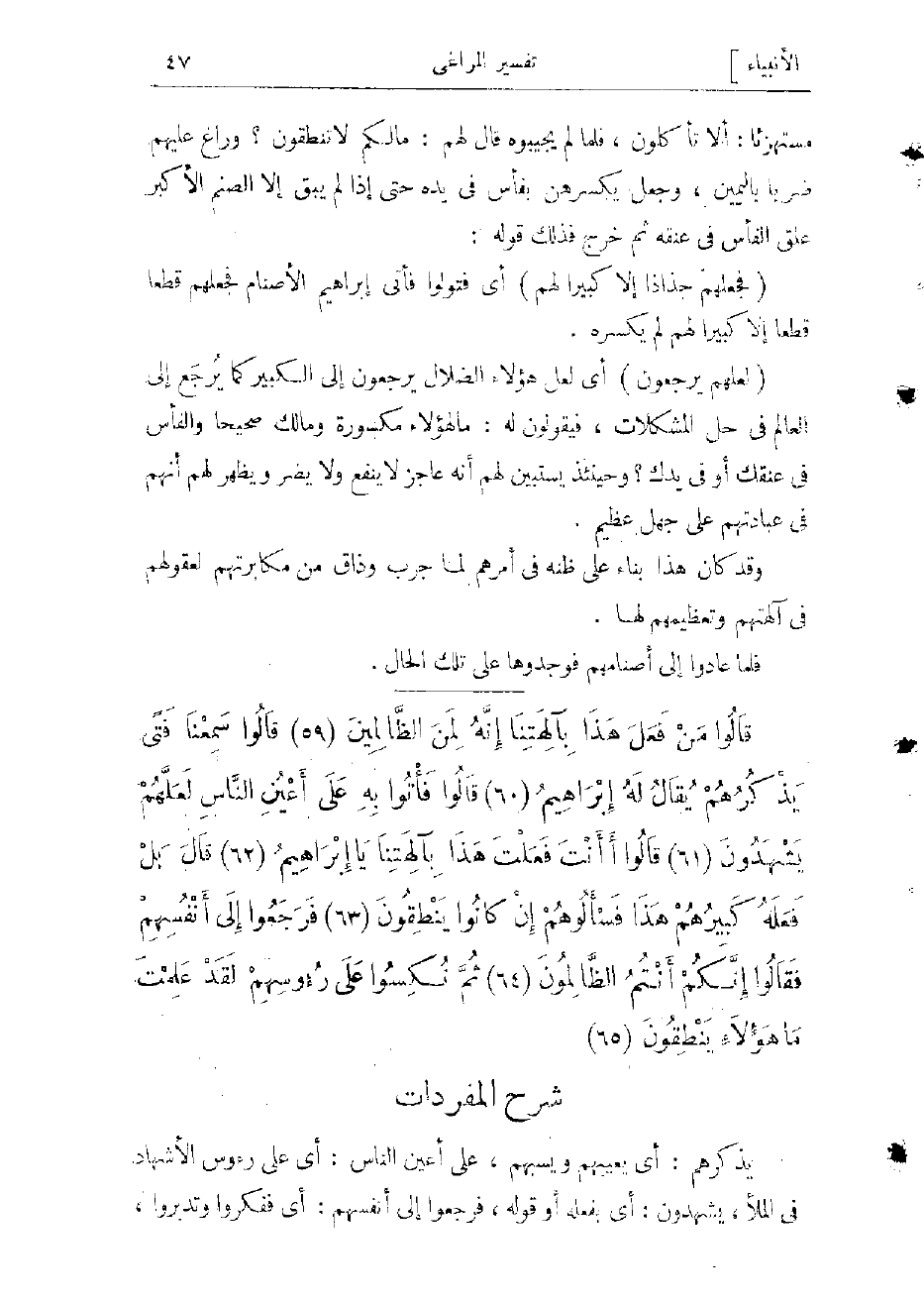 ألا تأكلون، فلما لم يجيبوه قال لهم: مالكم لا تنطقون؟ وراغ عليهم ضربا باليمين، وجعل يكسرهن بفأس فى يده حتى إذا لم يبق إلا الصنم الأكبر علق الفأس فى عنقه ثم خرج فذلك قوله: